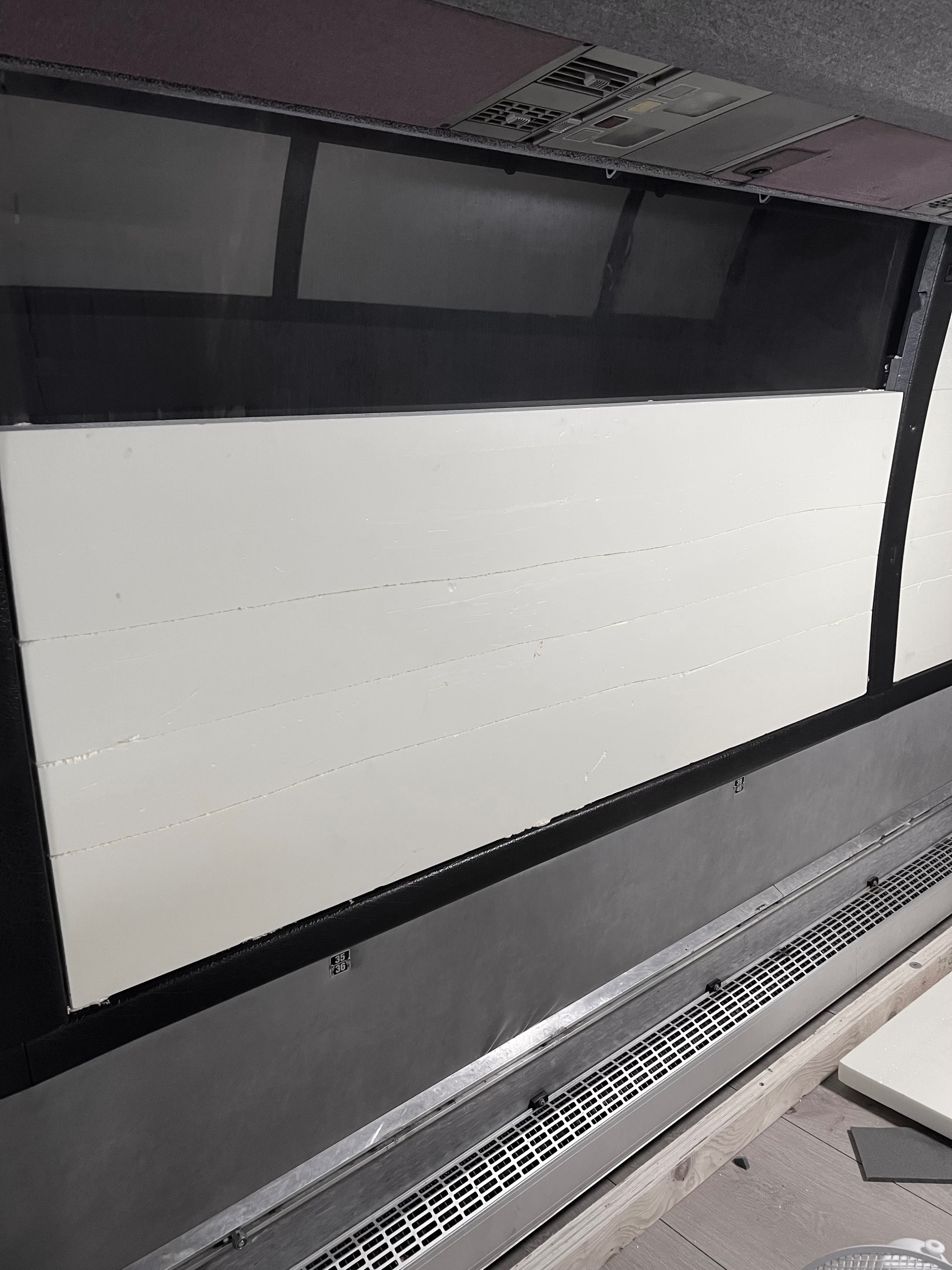 Aika pimmee tulee näköjään kun noita ikkunoita lyö umpeen. Ajattelin jos jättäis keittiön kohtaa lasin yläosan ilman finnfoam palaa. Alaosaan vaneri ja joku kulmalista finfoamin reunaan. Ikkunat jotka umpeen laitettu niin kalvo tulossa ulkopuolelle..