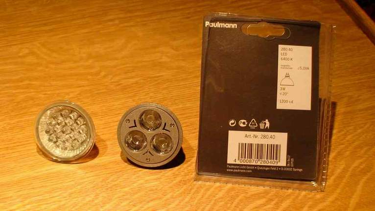Heillä on teholedejä myynnissä eri kannoilla eri tehoisia ja eri lämpöarvoilla. itse ostin sieltä 39,80€ 3-ledisen 3W GUI 5,3 kannalla varustetun polttimon ja tämä antaa 20 asteen avauskulmalla valon värillä ja määrällä 21W GUI 5,3 lampun verran valoa. kuvassa vieressä on Claes Olssonilta 8,90€ 21 ledinen 2W GUI 5,3 lamppu ei anna edes 6W halogeenin verran valoa ja lisäksi kalman sinisenä. Kuten kuvasta näkyy niin 3-ledisen valovoima 1200 cd.