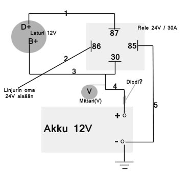 Tuohon kannattaisi laittaa D+ ja releen 87 väliin vastus tai merkkivalo, jotta 12v laturin kenttädiodit ei pala jos jostain syystä virtaa meinaa kulkea D+:n kautta enemmänkin, esimerkiksi jännitehäviöistä johtuen, jos joskus kaapelien liitokset hapettuu tms. Tai vähintään jokin pieni sulake.