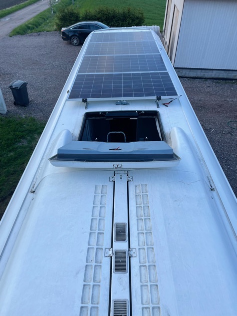 Katolle on ilmestynyt 4kpl 100*170 kokoisia aurinkopaneeleita, eli noin 6,8m2 paneelia. Jalustojen kiinnitys kattopellin läpi runkopalkkeihin peltikattoruuveilla, ja polymeeriliimalla. Jalustojen päälle alumiiniprofiili johon erityisillä kiinnikkeillä paneelit kiinni. Kytkentä tehty hybridi-invertteriin.