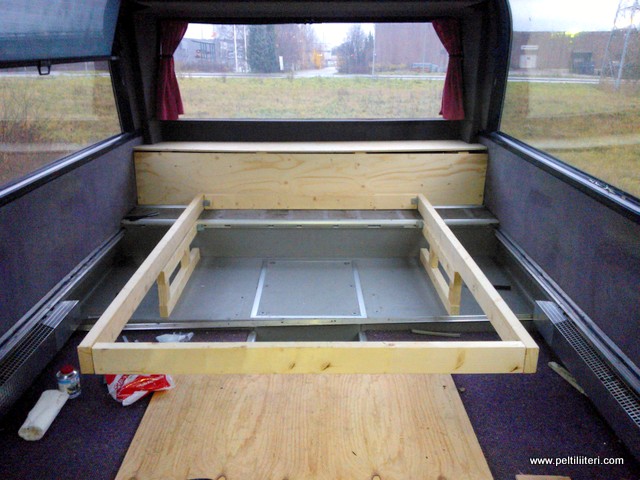 Nakertelu jatkuu. Takaosaan syntyy boxi (9mm vaneri) peittämään moottoritilan korotuksia (jotka olleet takapenkkien takana). Samoin parisängyn hahmottelua, jotta osaa tehdä sille sokkelin. Ajattelin tehdä sängyn saranoituna tuolta boxin päästä, jolloin koko sen alla oleva tila tulee säilytystilaksi ja kameraa lähinnä oleva pää nousee ylös. Kaasujouset reunoihin keventämään avausta.
