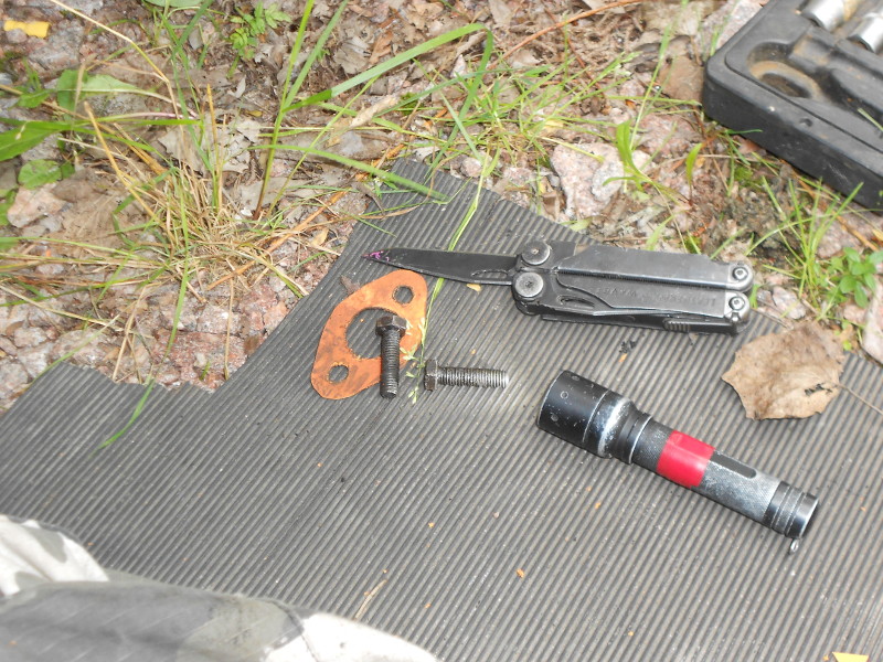 Laitoin auton käyntiin ja kompuran suunnalta alkoi kuulumaan kovaa suhinaa. Vika paikantui kompuran lähtöpuolen putkilaippaan eli tiiviste oli mennyt rikki. Puskaolosuhteissa en todellakaan halunut alkaa sitä korjaamaan.