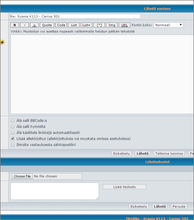 Tuolta "Choose File" -nappulasta saa liitettyä kuvia mukaan. Kuvien koko kannataa pitää maltillisena. Toinen vaihtoehto pn laittaa linkki johonkin kuvaboxiin, mutta ne ei kestä aikaa. Tyhjiä linkkejä on vanhoissa kirjoituksissa paljon - infomaatioarvo on tasan nolla. Hienot projektit muuttuvat tyhjiksi neliöiksi.