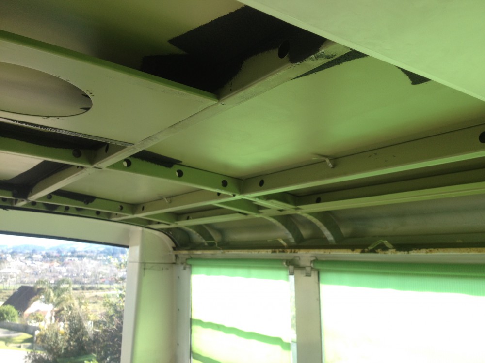 Jossain vaiheessa raahauduin kuolemantaudin kourista bussityömaalle, otin akkukoneen käteen ja aloin ruuvaa. Tossa on ihanasti kaikki asiat ruuveilla kii, niin et sen pystyy halutessaan akkukoneella purkaa koko pyydyksen. Perästä käsin kaks puol metriä pudotin kattovaneerit alas ja kaivelin lasivillat pois. Toisin ku Berkhof:issa, Hino:n eristystyöryhmä on tehny erinomaista jälkee. Joka kohdassa oli just oikeenkokonen palanen villaa alumiinipaperi yläpuolella kattoo vasten, eikä tyhjiä koloja ollu missään!
