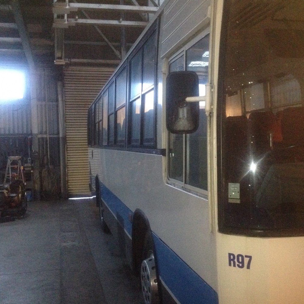 Kone on Hino M10U 9.9l, 230ps, vapari. Älyttömän luotettavassa maineessa. Toi on ollu noilla 15-vuotta, eikä oo koskaan tarvinu tehdä mitään remppaa. Toisaalta näillä viritysasteilla alkaa tommonen 300 000 ajettu kone just vasta käymään nätisti! Nää on suurimmaks osaks Japanista harmaatuotuja vehkeitä ja siellähän kalusto seisoo pääasiassa jonossa. Sen jälkeen näillä kavereilla lentokentältä geyshirille ja takas ja loppuaika kouluajoa, vähän taajaman ulkopuolelta koululle ja illalla takas. Koulukyydeissä bussi ei saa olla vanhempi ku, tänä vuonna 1991. Laske siitä, ite en osaa - kello on yli yheksän illalla. Ylimääränen kuitenki...