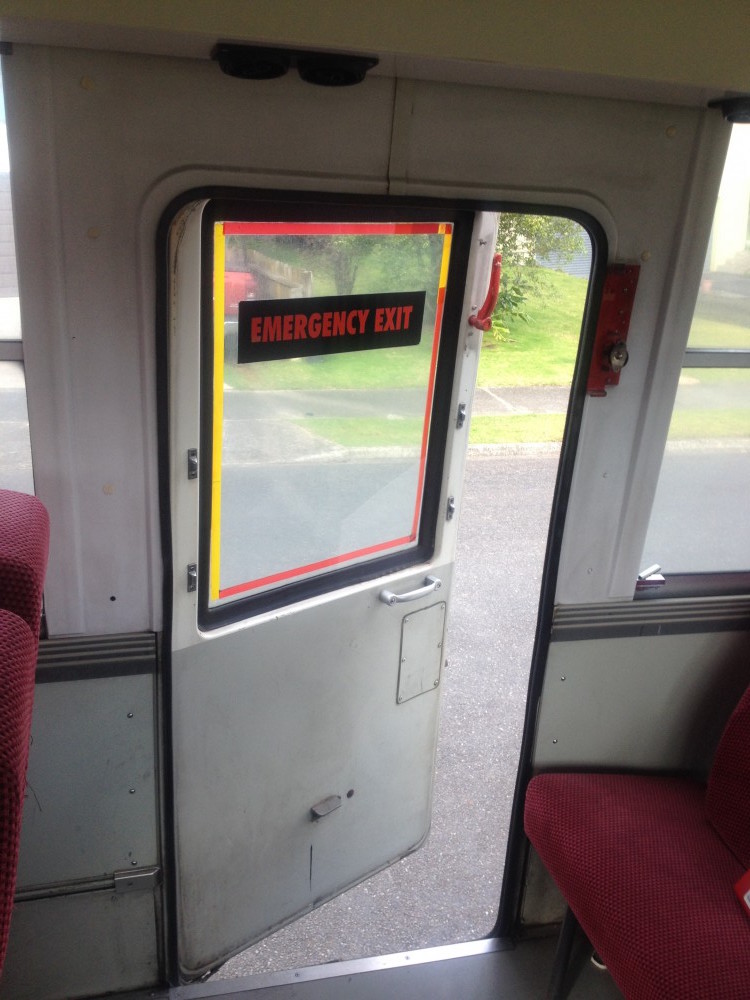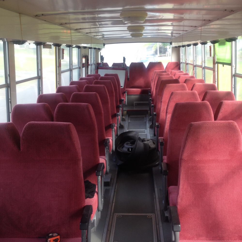 Ei oo tasalattia, niinku kaikissa muissa Berkhofeissa, paitsi mun, vaan matala, oisko 5cm keskikäytävä. Kangasverhoiluilla ei tässä vehkeessä juhlita, vaan katto ja seinät kiiltää kilpaa. Kaks vasaranmentävää hätäulosikkunaa (ja takalasi) ja sit keskiviivan puolella hätäpoistumistakaovi, muuten kaikki ikkunat alhaalta ylös aukeavia liukuikkunoita. Yksinkertasia tiätenki! Penkeissä kiinteä selkänoja ja yks iso istuma-asia kussakin. Linja-autossa ei tarvii turvavöitä.