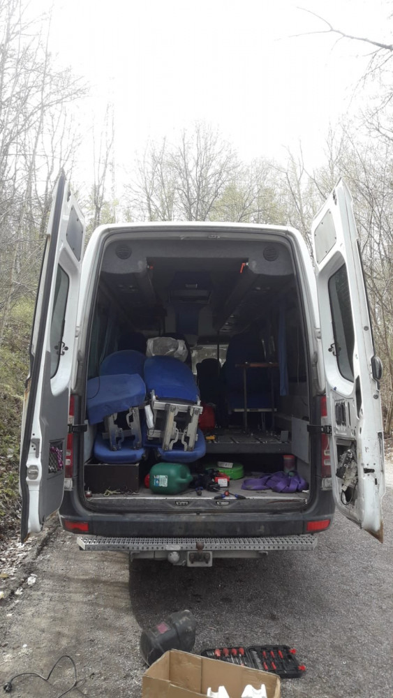 Sprintterin muovirimpulalukot. Takaovi meni umpijumiin ja jouduin purkamaan sisäkautta pääsyn lukolle. Rosvosahalla vestakappale palasiksi ja vapaus koitti. Onneksi takakontti oli lähes tyhjä ja penkit pikalukoilla, joten mahtui työskentelemään. Takaseinässä on lukitumekanismi, jonka saa avatattua kontin puolelta ja hieman hankalammin matkustamon puolelta...