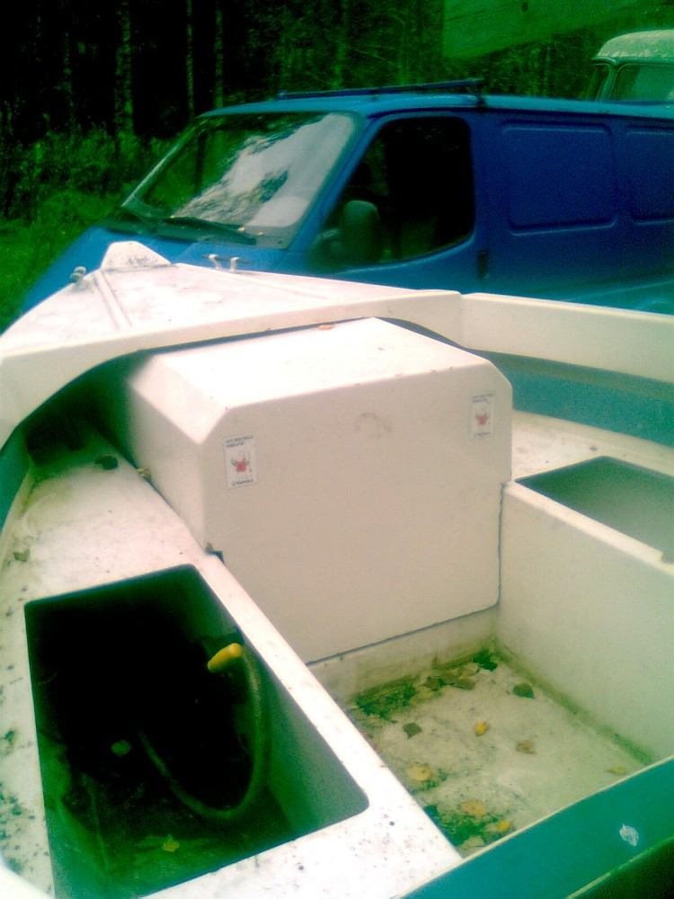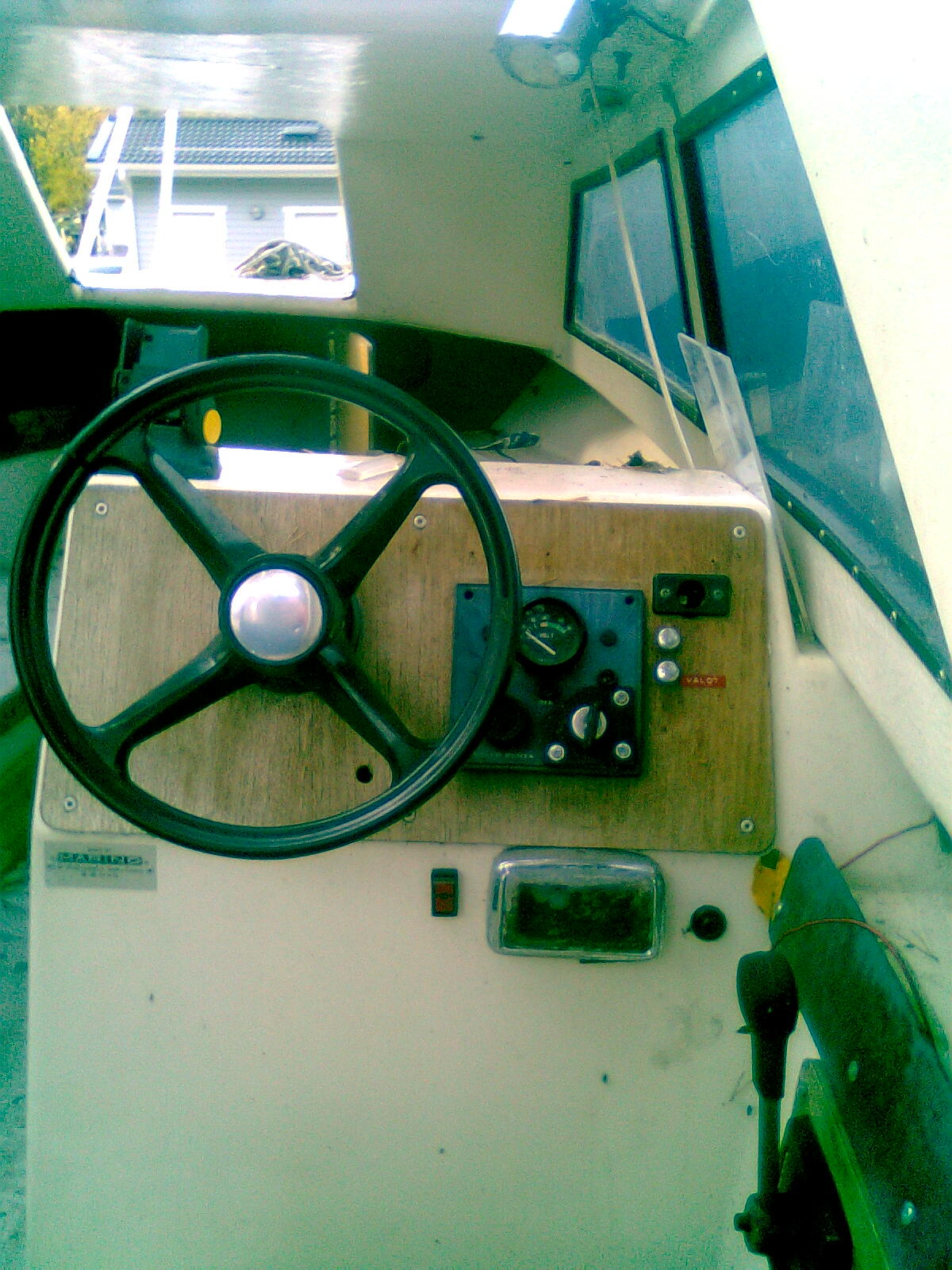 Kone näytää olevan Volvo-Penta MD 5, teho versiosta riippuen 7,5 aina 10 hevosvoimaan. Mulla oli omassa 4 tonnin ja 9 metrin paatissa se pienitehoisin, kulutti normi huviajelussa noin litran tunnissa dieseliä nopeuden ollessa jotain 5,5 solmua. Vipu vinossa antoi jo sauhua putkesta kulutuksen kolminkertaistuessa ja vauhtia sai huimaavat 6,5 solmua