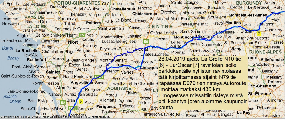 Seuraavana aamuna oli siten 3,8 astetta plussalla Volvon kylmäkäynistys systeemit eivät toimi hehkutus vastuksen poltin liika hehkutuksellä ja kylmä ryyppy = tuplla anostettavan polttoaine syötön ei taida toimia. Siis vanhanaikainen startti, Kaasupoljin pohjaan ja pitkä startti. Tienoo peittyi savuun josta voi päätellä että startti oli onnistunut. Siitä kilometrin korkeudesta sitten lähimme laskeutumaan meren pinnan tasolle. Ranskassa olikin jo 21 astetta parhaimmillaan. Bordeaux kehätie oli pahasti tukoinen nyt kiertä vastapävää kesti tunti ja vartti. Mutta A10 ja kohta N10 vetivät hyvin joten pääsimme klo 19 syömään La Grollessa olevaan ravintolaan jossa olimme myös kaksi päivää matkalla alaspäin.
