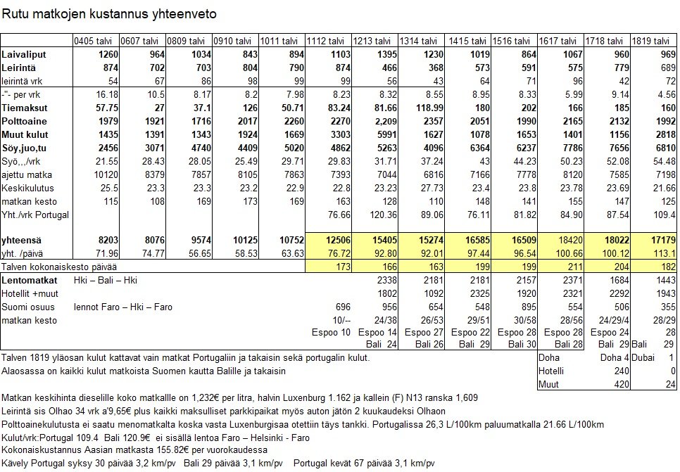 Yhtenvetona talven aikana kirjattu kävelyä 409 km dieseliä kului matkalla 2052 litraa. Aurinkokennot tuottivat energiaa 148,8 kWh. Kaasua käytimme 11 kpl 11kg pulloa joista kahdessa oli vain viisi kiloa kaasua, 12-.ta otettiin illalla Travemunden laiturilla käyyttöön odottaessamme laivaan ajoa. Muut tiedot löytyy oheisesta taulukosta.