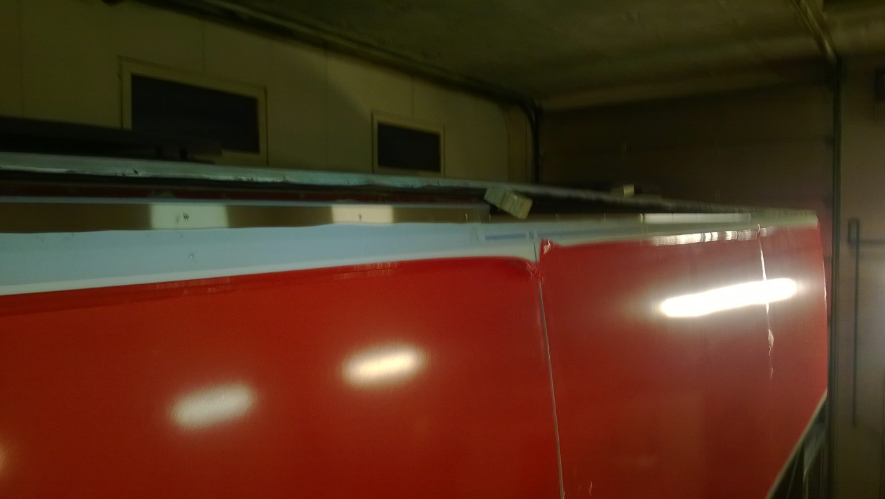 Nysväsin ton rst listan myös tonne seinän yläpäähän...liimalla ja poppareilla... Sitte nostelin pellin (katto) varovasti parisenttiä irti rungosta laudan ja vanerilevy palojen kanssa.... tämän jälkeen olikin sitte tosi v..mäinen homma... olin hommannu noihin helmahässäköihin semmosta "bitumimönjä" nauhaa jossa on ihan "sairas" tarttuvuus...ja todellakin tarkoitan sitä...(siis tarttuvuutta en sairautta) Pelti ku oli ylhäällä putsasin sen pölystä ja muista epäpuhtauksista ja samoin tuon rungon ja taistelin nauhan kiinni siihen...(runkoon) sitten "vaan" suoja teippi pois ja laskin kattopellin kiinni siihen... vähän peltivasaraa et muutamat purkuvaiheessa aiheutuneet mutkat oikes ja vot...siinä istuu... En tietenkään uskaltanu jättää tota kattoo pelkästään ton nauhan liimojen varaan vaan niittasin sen "samoihin reikiin" mitä tehtaalla...