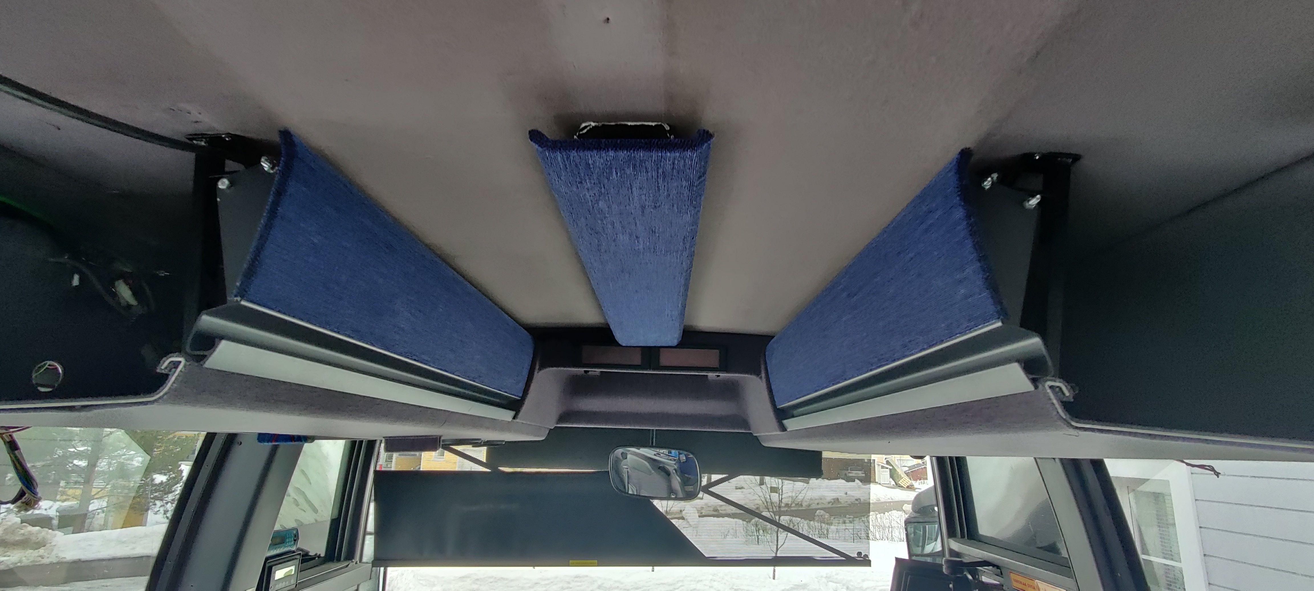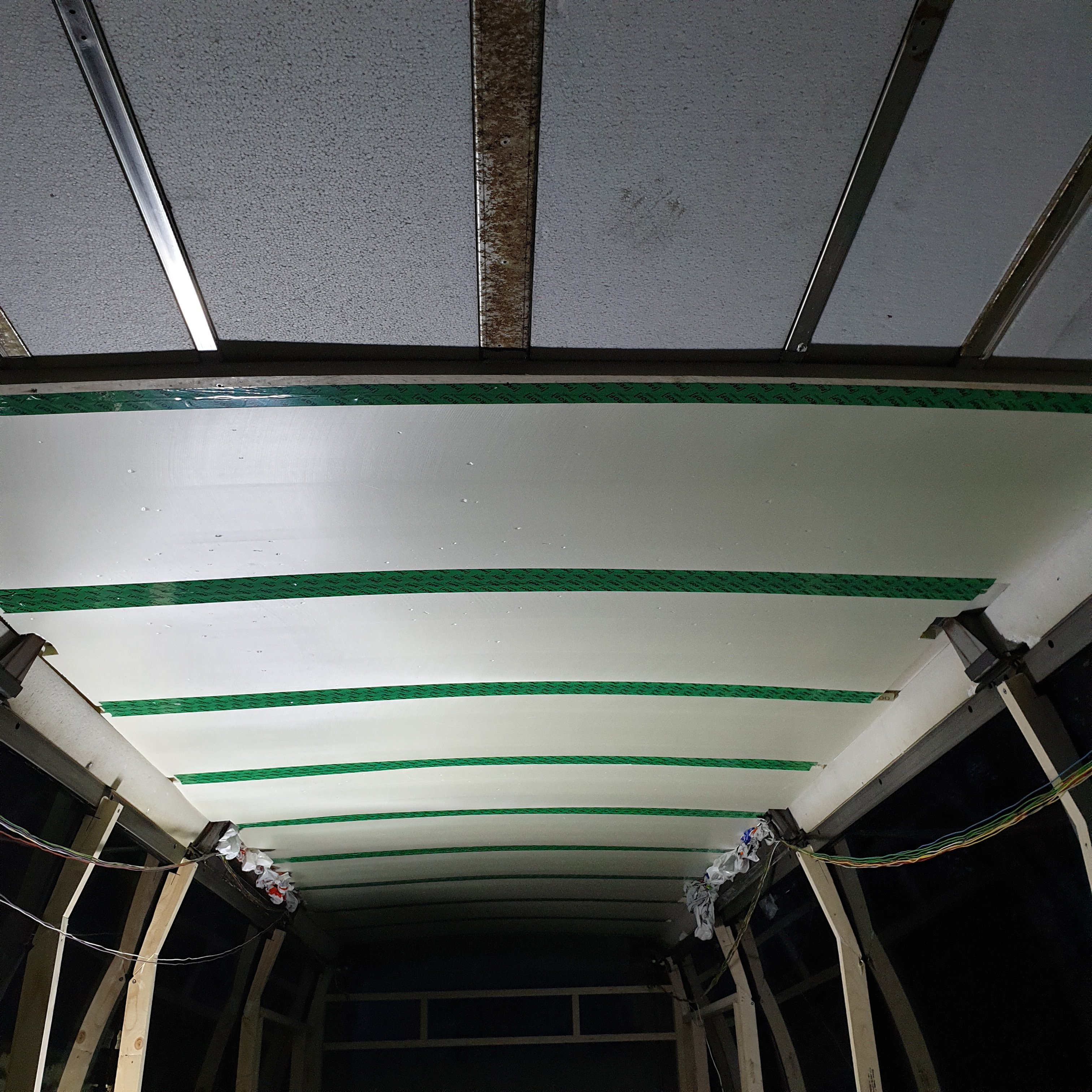 Tällä säätötoimenpiteellä sain kattokanavan "oikeanmittaiseksi" siten, että kuljettajan taakse jää yksi penkkirivi, nuo pitkät luukut ovat sattumoisin juuri oikean mittaiset. Tuo loisteputkien suojapelti keskellä ylhäällä ei ollut tietenkään oikeanmittainen, joten käytin sen irti, revin verhoilun takaa n. 5 cm leikkauskohtaa kauempaa irti, katkaisin laikkakoneella rännit ja sitten liimasin verhoilun takaisin tuohon päälle Scotchin "iäksi kiinni" -mattoteipillä. Näin keskitrimmi saatiin päättymään samaan kohtaan kuin nuo luukutkin. Seuraavaksi tulee eristetty seinä matkustamolle, siihen ajattelin laittaa oveksi tuon paskahuusin oven, joka on just sopivan kokoinen ja hyvänvärisellä verhoilullakin.