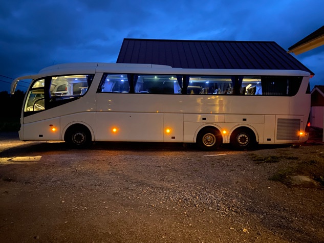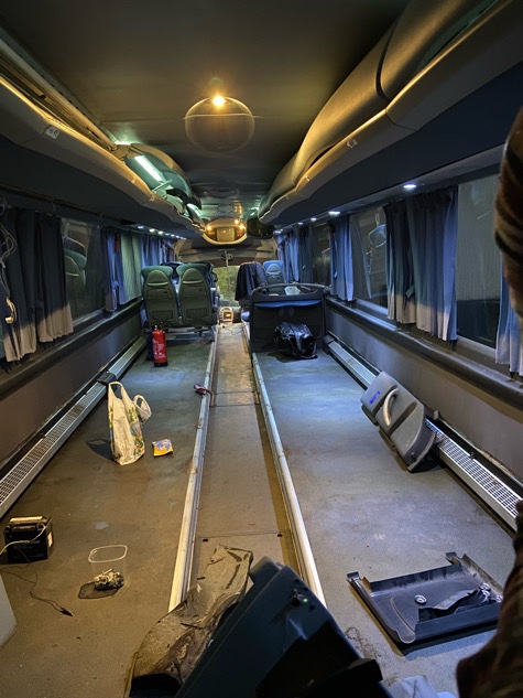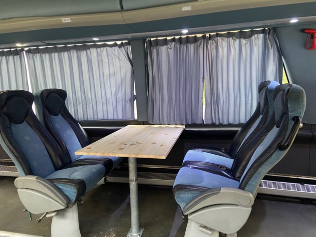 ”Eturiviin” jää ohjaamon puolelle 4 penkkiä. Niiden taakse tulee lämpö/melueristetty väliseinä jossa ovi. Katon rajaan tulee alkuperäiselle paikalleen moderni matkanäyttö jossa Chromecast ja tälle eturiville omat kuulokeliitännät. Kaiuttimiin ei töllön ääntä saa. Takana on sitten isompi. Jos lasten meno yltyy liian rajuksi, ne voi komentaa väliseinän toiselle puolelle matkustamaan. Sieltäkin varmaan löytyy aktiviteetteja. Ah, kuskin seesteinen hiljaisuus omassa melueristetyssä kopissaan… Omat gospelit soi siellä.