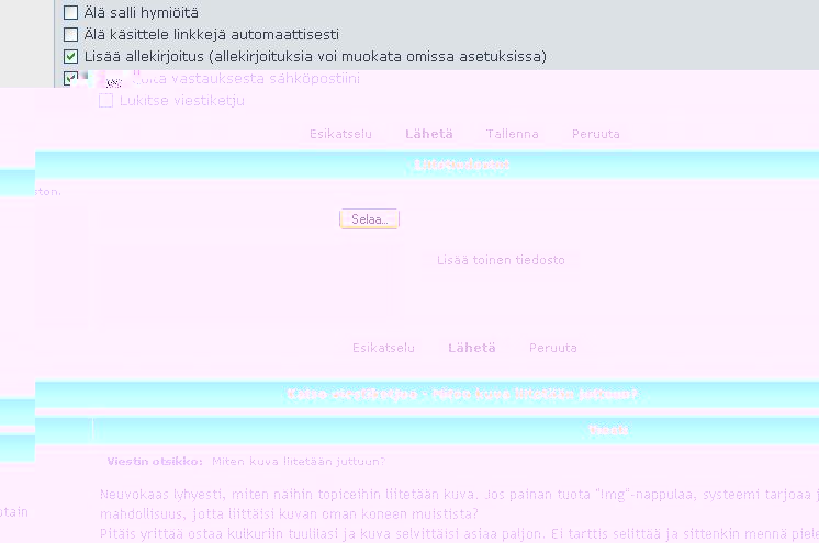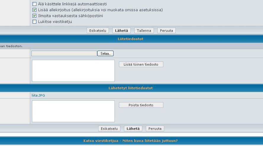 Vastaat viestiin (tai muokkaat omaa viestiäsi),niin tosta näkyy mun kuvasta, eli valitset "Selaa", löydät omalta koneelta kuva, painat "Avaa" tai "Open", sitten painat "Lisää toinen tiedosto" ja se ilmestyy ruutun tuossa alla