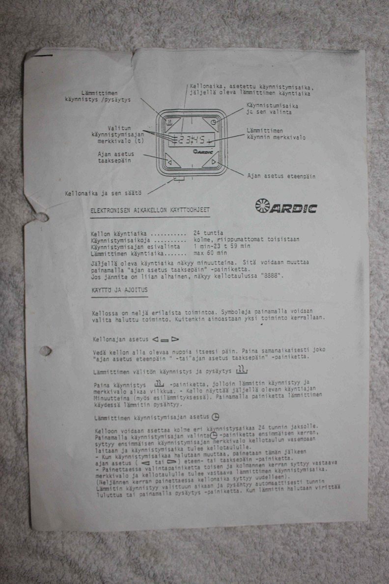 Mitenkähän käytetään arctikin ohjausyksikköä,tarkotan sitä mustaa laatikkoa joka on autossa sisällä ja painetaan neljästä nurkasta vihreät numerot keskellä.Latikon tyyppi on vfa 3713977 ja on Hellan valmistama.Sillä ohjataa volskin lisälämmitintä.Koitin gooklettaa en löytäny käyttö ohjetta siihen.