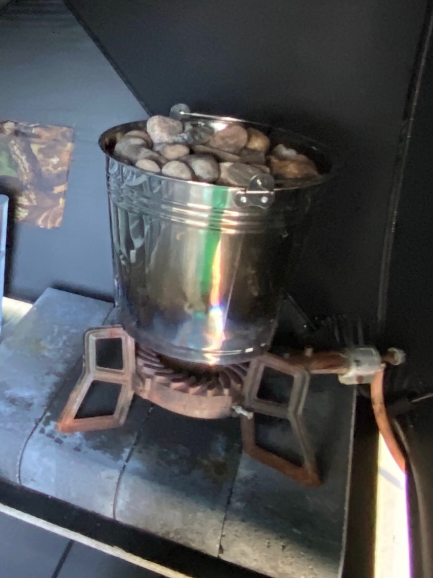 Hain viimekesänä metsästysteltan motonetista ja värkkäsin rengaspolttimen päälle ämpäristä ”kiukaan”. Ämpäristä pohja pois rälläkällä ja pohjalle teräsverkosta kartio, jonka päällä kivet pysyy. Tällä tyylillä kivikasa lämpiää puolessa tunnissa todella kuumaksi ja saa hyvät löylyt, mutta poltin täytyy sammuttaa löylyjen ajaksi. Pitäisi kehitellä keino saada tuli kivikasan läpi ylös, mutta vesi valuessaan ohi polttimesta, niin tulta voisi pitää päällä ja löylytellä pidempäänkin.