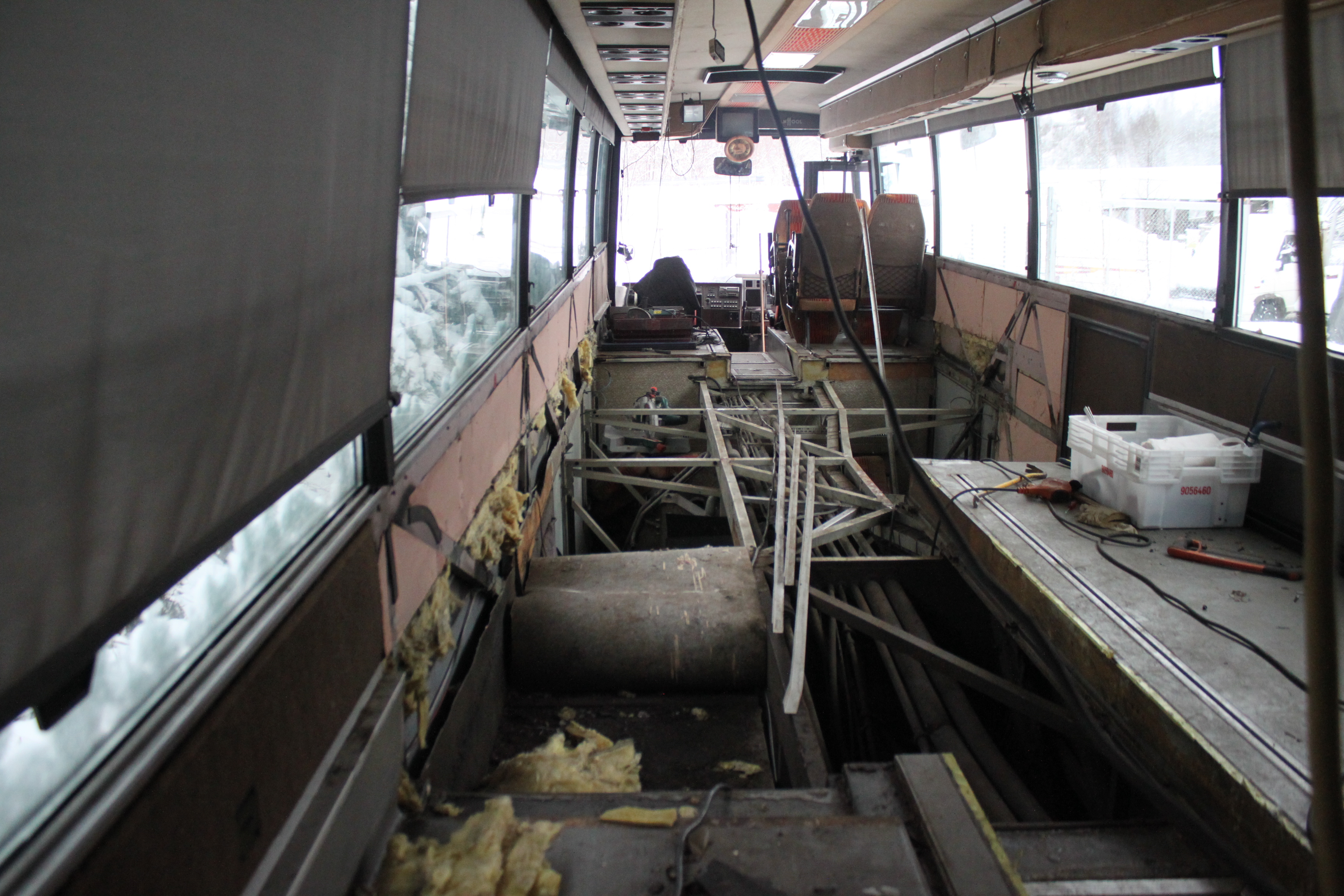 Olen pikkuhiljaa purkanut vessan ja lattiaa. Oikaisen suurimman osan lattiasta. eteen laitan kaksi pöytäryhmää, yksi kummallekin puolelle käytävää ja niiden takaa lattia tasaiseksi ja lattialämmitys. Kattokanavat täytyy purkaa. Keskioven aion laittaa umpeen jne.