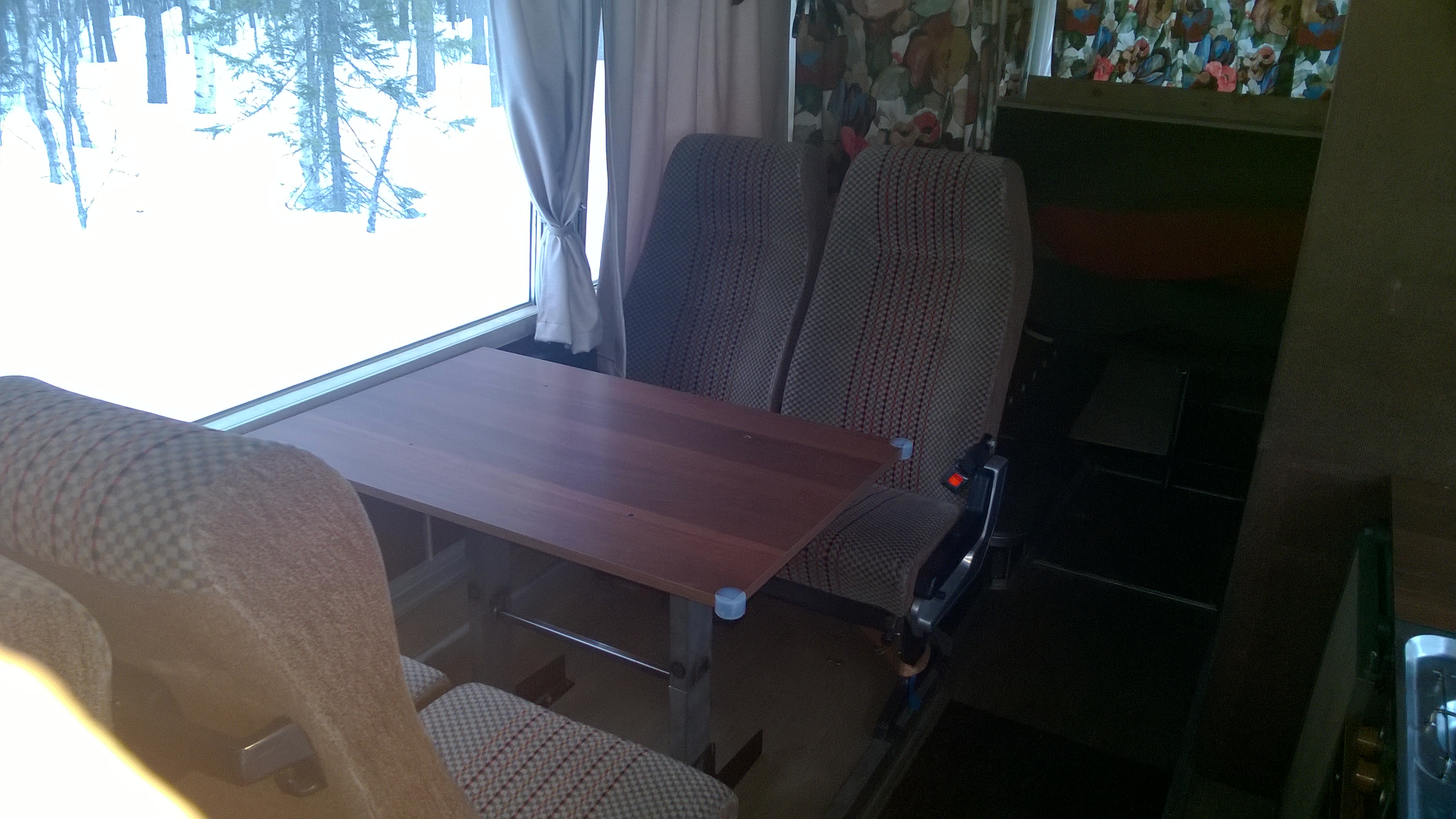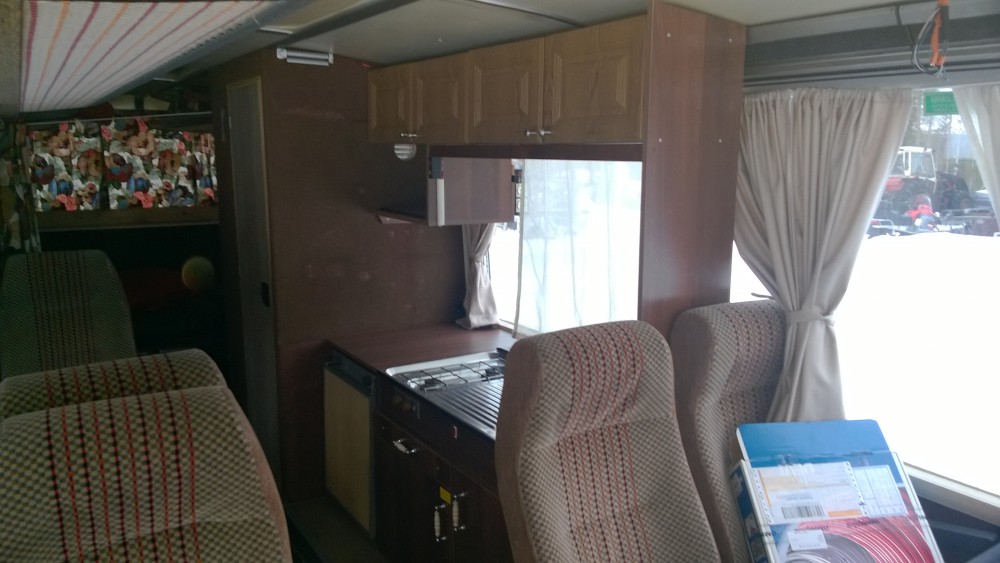 Mittailin tallin oven korkeutta suhteessa bussiin, pitäisi mahtua kun ottaa lisälämmittimen pois katolta. Eipä tuota ole koskaan tullut käytettyä. On mukavampi rakennella kun saa sisälle.
