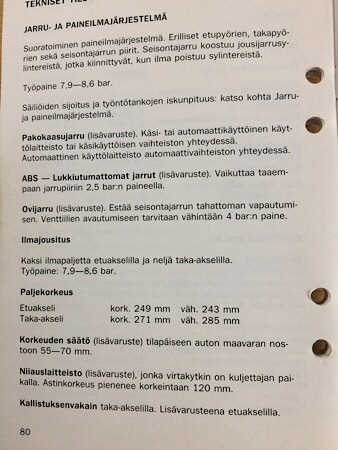 Uusi vikakin löytyi reissussa, tasonkorotuksen venttiili (?). Tämä on siis tasonsäätöventtiilin ja jousien välissä oleva venttiili tms. toimilaite, johon tulee ohjauksena paineilma tasonkorotuksen magneettiventtiililtä. alkoi vuotamaan läpi venttiilin kyljessä olevasta noin 1,5 mm reiästä, onneks on pieni reikä, tulee vain vähän ilmaa, pystyy ajamaan. Katsotaan kun (jos) päästään kotiin asti. Uutta tuskin saa mistään ja näytti niin hapettuneelta että avaaminenkaan tuskin onnistuu.