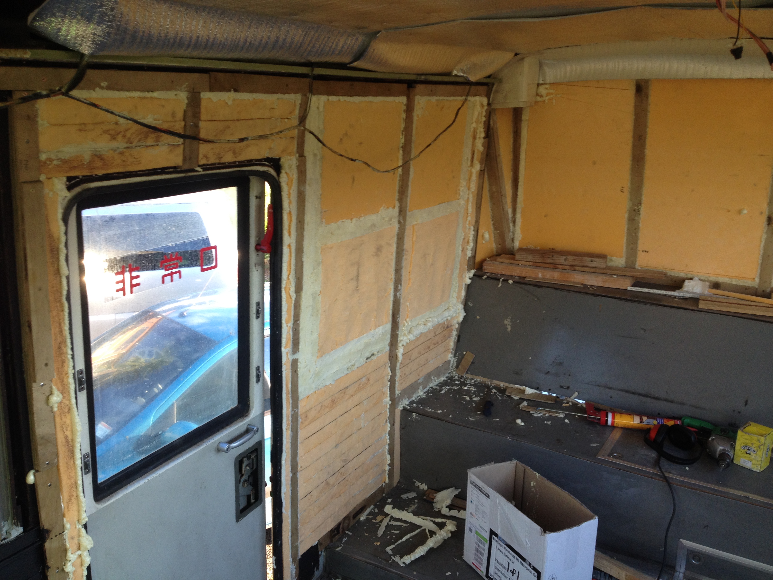Seinistä kaikki purettavat asiat purettu. Tuulilasille asti päästiin, siitä pitemmälle ei sitte millään! Lasivillat kuikassa ja vimmatun rälläköinnin jälkeen paljon hankalanmallista metallisälää lattialla. Tossahan oli niinki ihanasti, ku mikkiliimalla, hoidettu rullaverhojen päädyt seinään kii. Ne on nyt tiessänsä ja seinän kehystys on ojanpuolella likipitäen valmis. Umpeen ei matkustamo-osan sivuseiniä vielä voi laittaa, ennenku on turvavöiden kiinnityspalkit kii. Ne pitää olla hitsaamalla seinässä ja lattiassa. Kohtuullisen persevä vaatimus. Mie yritän selittää niille sen kylmäsilta-asian, ni josko ne vaikka muuttais lakia.