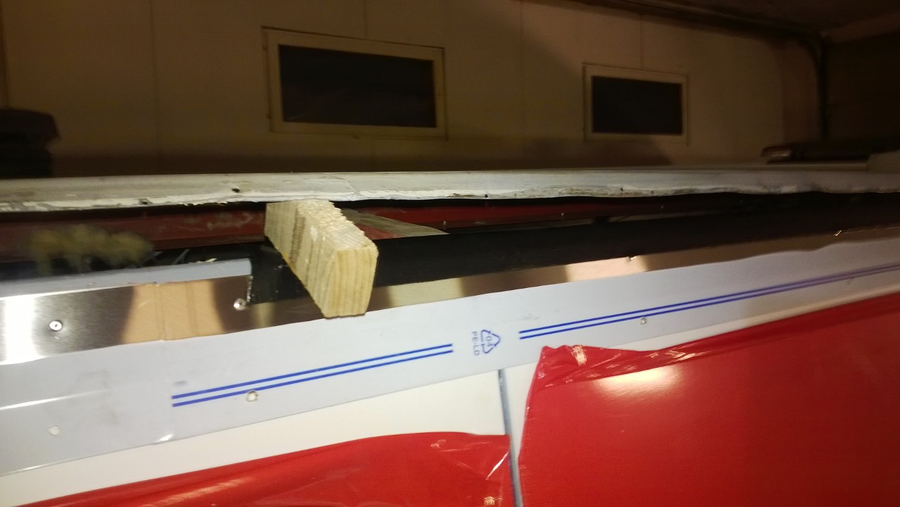 Nysväsin ton rst listan myös tonne seinän yläpäähän...liimalla ja poppareilla... Sitte nostelin pellin (katto) varovasti parisenttiä irti rungosta laudan ja vanerilevy palojen kanssa.... tämän jälkeen olikin sitte tosi v..mäinen homma... olin hommannu noihin helmahässäköihin semmosta "bitumimönjä" nauhaa jossa on ihan "sairas" tarttuvuus...ja todellakin tarkoitan sitä...(siis tarttuvuutta en sairautta) Pelti ku oli ylhäällä putsasin sen pölystä ja muista epäpuhtauksista ja samoin tuon rungon ja taistelin nauhan kiinni siihen...(runkoon) sitten "vaan" suoja teippi pois ja laskin kattopellin kiinni siihen... vähän peltivasaraa et muutamat purkuvaiheessa aiheutuneet mutkat oikes ja vot...siinä istuu... En tietenkään uskaltanu jättää tota kattoo pelkästään ton nauhan liimojen varaan vaan niittasin sen "samoihin reikiin" mitä tehtaalla...