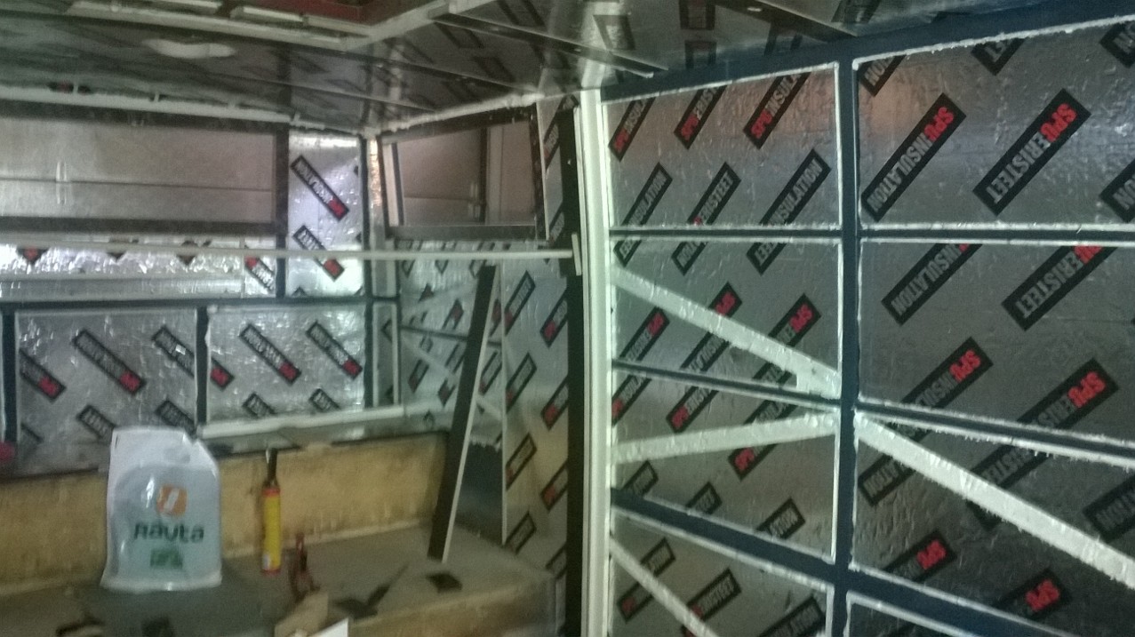 en ehtiny saada tänäänkään koko eristys hommaa nippuun...(aloitin niin myöhään iltapäivällä) mutta nyt olis suuret seinä-alat eristelty ja jäljellä olis ns. matkustamon "tilkkutäkki" en muuten eristäis sitä samoin mutta mää ny yritän saada koko kotteron samalla tavalla eristetyks jos vaik se ei kesällä ihan niin paljoo lämpeis ja talvella ei kylmää hohtais...:D