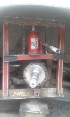. Onneksi Youtubesta löyty video missä kaveri otti tapin irti hydrauliprässillä. Ei muuta kuin rakentaa sellanen. Eka proto.... liian heikko hajos 12TN tunkilla. Kakkos proto... hajos alapäästä 20TN tunkilla. Kolmas proto... Kestää, vaan ei lähte tappi irti. Ei löydy lainaksi isompaa tunkia jolla puristaisi. Ei muuta kuin vuokraamaan isoin Hilti mitä voi käsin kannatella. Lovi taltan päähän ja PAM....ekalla irti. Täysin ehjä tappi tulla tupsahti pihalle. Ja tuon irroitukseen oli mennyt neljä päivää. Eihän se tappi ollut kulunut vaan välys johtui siitä etupyörän uloimmasta laakerista