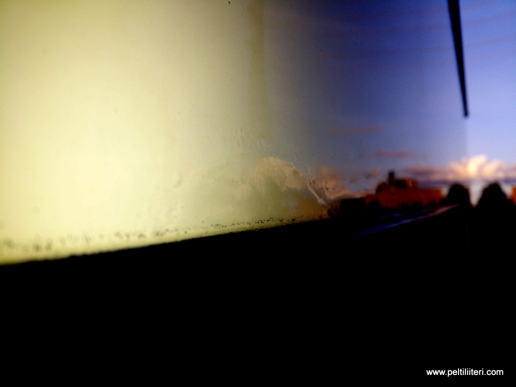 Ulkopuolella kokeilen vähän maalaushommia tulevina viikkoina. Edellinen maalari on vähän huonosti tehnyt pohjat kylkilistan kohdalla ja siitä alkaa nyt alumiinin korroosio kiipeemään ylöspäin. Aattelin kokeilla katkaista etenemisen. Pintaväri Oy;ssä kävin juttelemassa, ja täytyy sanoa, että todella hyvää ja asiantuntevaa palvelua sain, vaikka kuinka kysyin niitä normaaleja tyhmiä kysymyksiä. Paukkupulloihin teetän ton omaa väriä, niin on helppo paikkamaalata. Happomaali ja silikonin poistaja lähti jo matkaan.