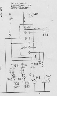 Boksin kannessa olevan kaavion mukaan elektronisen termostaatin (344) nastoihin 1 ja 2 tulee aina virta jompaan kumpaan, nasta 1 menee ohjausventtiillle ja nasta 2 lämminilmapuhaltimille. Mittasin myös ja näin se toimii. Minulla oli tehty oma kytkentä niin että puhaltimet ja venttiili oli kytketty nastaan 2 ja nasta 1 oli tyhjä. Varmaankin sen takia että saadaan molemmat päälle yhtä aikaa...?