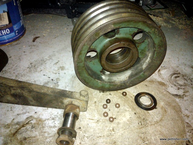 Nyt kun sai sisähommia tehtyä, voi hetkeksi sotkea sormet rasvaan. Hyvin irtosi toi hihnapyörä, ja laakeritkin irtosi pikku lämmityksellä ja napautuksilla.