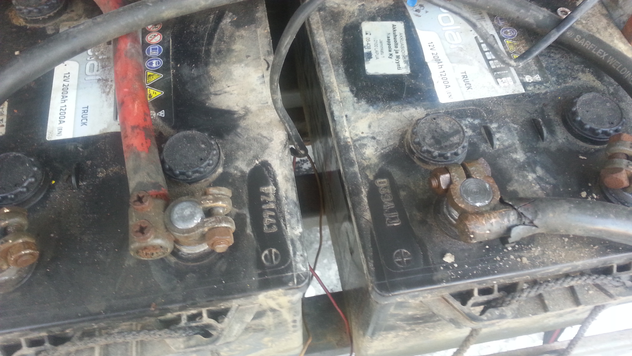 Vaihdoin naftasuodattimet ja tyrkkäsin kokeeksi laturin starttiakkuihin kiinni. Ihmettelin miksi kipinöi kun sihtailin laturinjohtoja väri väriin. Vedin akkutelineen ulos ja oliki hassu ylläri piuhoissa.