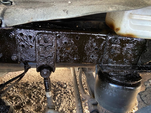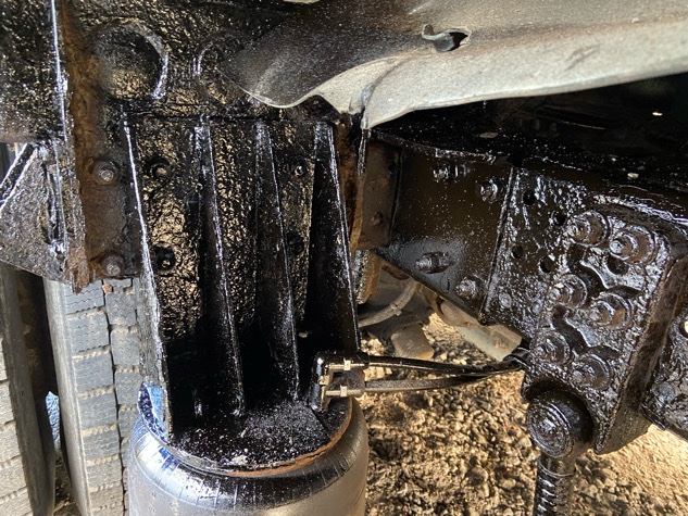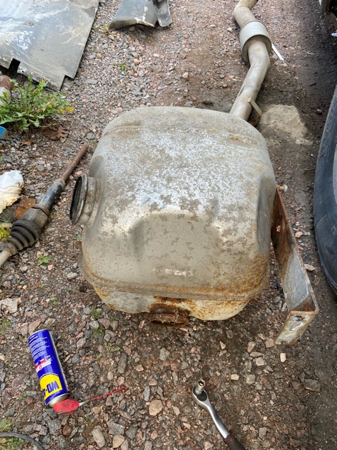 Eilen ja tänään siistin runkoa. Vasaralla paukutin suurimmat ”voitaikinakerrokset” pois ja ruiskutin pintaan pari litraa moottoriöljyn, alustamassan ja tärpätin seosta. Öljyä seoksessa n.puolet, ja tarkoitus on että massa sitoo öljyn pysyvästi kiinni runkoon. Saa nähdä miten onnistuu. Ainakin on siistimpi kuin ennen. Ruoste kyllä vaivaa nimenomaan tuota telin seutua. Edessä ja takana ei niinkään.