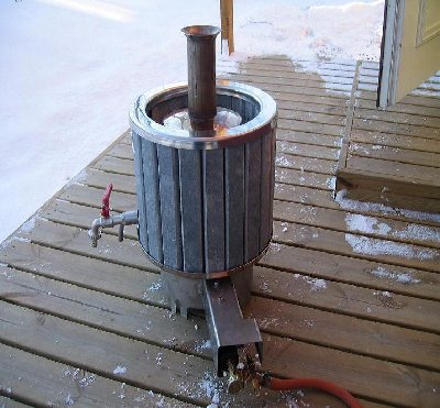 Hain viimekesänä metsästysteltan motonetista ja värkkäsin rengaspolttimen päälle ämpäristä ”kiukaan”. Ämpäristä pohja pois rälläkällä ja pohjalle teräsverkosta kartio, jonka päällä kivet pysyy. Tällä tyylillä kivikasa lämpiää puolessa tunnissa todella kuumaksi ja saa hyvät löylyt, mutta poltin täytyy sammuttaa löylyjen ajaksi. Pitäisi kehitellä keino saada tuli kivikasan läpi ylös, mutta vesi valuessaan ohi polttimesta, niin tulta voisi pitää päällä ja löylytellä pidempäänkin.