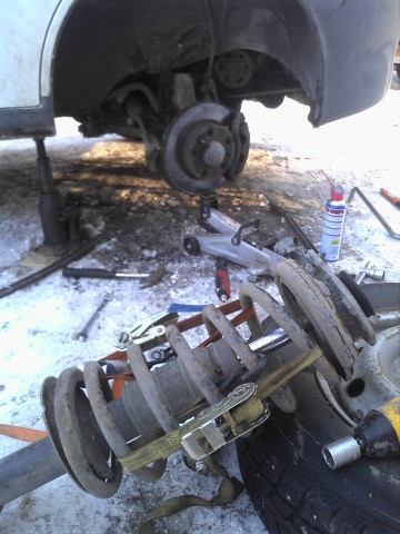 Tuohon on vaihettu iskarit, ja mukaan sain alapallot (ei ollukkaan kilvellä ollu väljää), yläpään laakerin kehtoineen, se jumittaa mutta en ole varma että on sittenkään oikea kuten myyjä sano. Pihassa kun laitoin tytön kääntelemään rattia ja kattelin nykiikö jousen yläpää, niin ei tietenkään nykiny kumpikaan! Kuoppia ku tutkaa niin kuskin puolelta kolahtelee kyllä vähän. Auton alla ku riuhtoo reidetankoa auton pituussuunnassa niin napsahtaa, mutta välystä ei oikein ole...