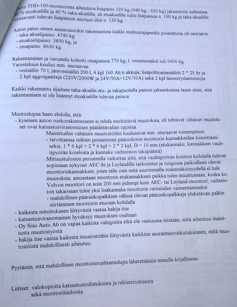 Siinä on kolmas kone menossa. Alunperin on ollut AEC joka alkoi syödä öljyä hirveästi joten liikennöitsijä luopui autosta joskus 80-luvulla. Harrastaja vaihtoi tilalle Leylandin koneen mutta ei ollut tyytyväinen sen menohaluihin. Leyland vaihtui sitten Volvoon joka kyllä kuljetti liukkaasti pientä bussia. Tämän seurauksena välityksiä piti muuttaa Scanian perällä. Jotenkin näin ja mitä itse ajelin tällä niin siitä harvinainen Volvo että kiihtyy ylämäkeen ;)