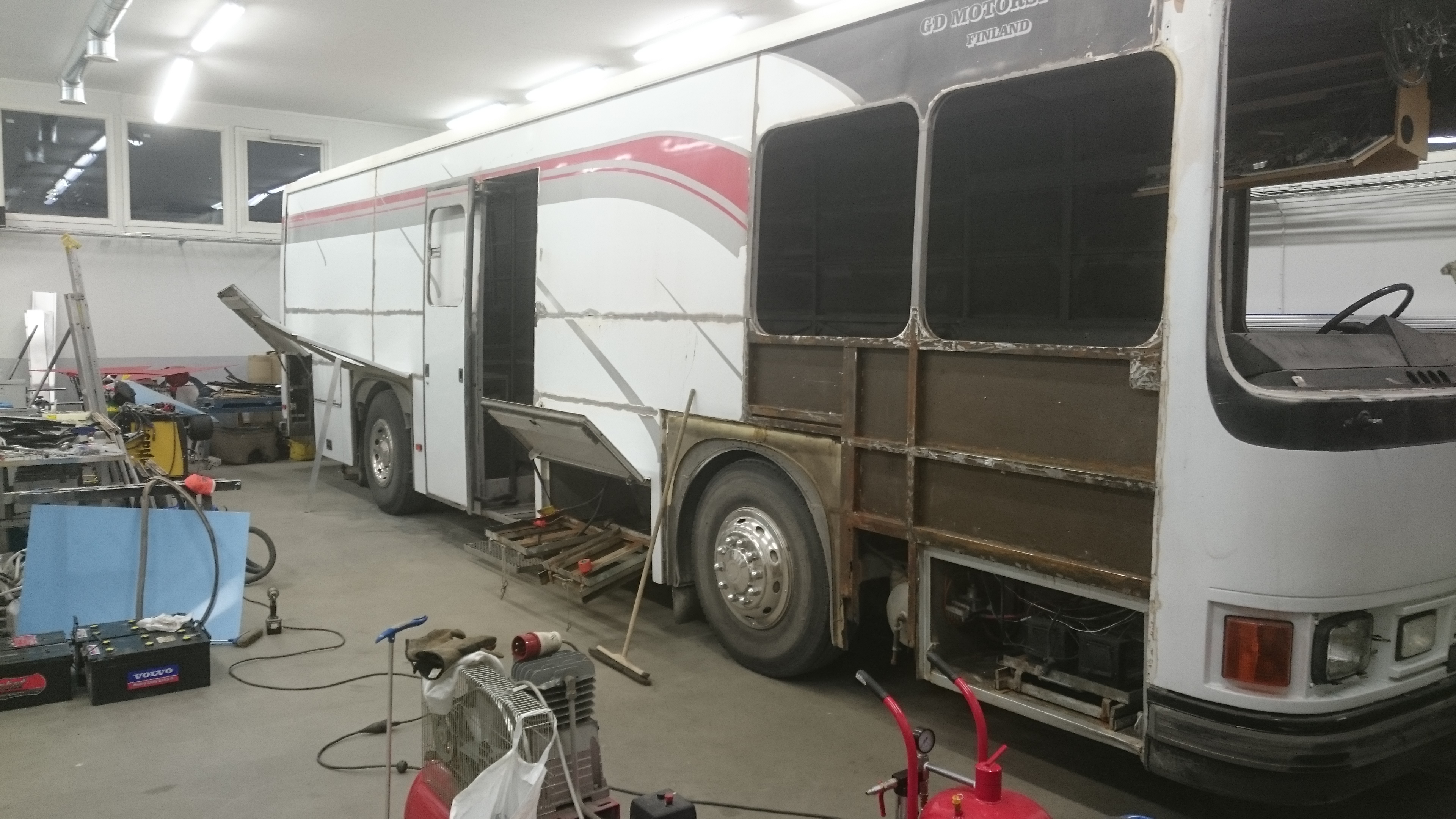 kun oli tarkoitus. Syksyn mittaan purettiin koko auton sisustus ja vähän muutakin . Hiekkapuhallus suoritettu ja ensiviikon loppuna tarkoitus alkaa suihkuttelemaan epoksia pintaan... onneksi hitsattavaa ei ole kovin paljoa.