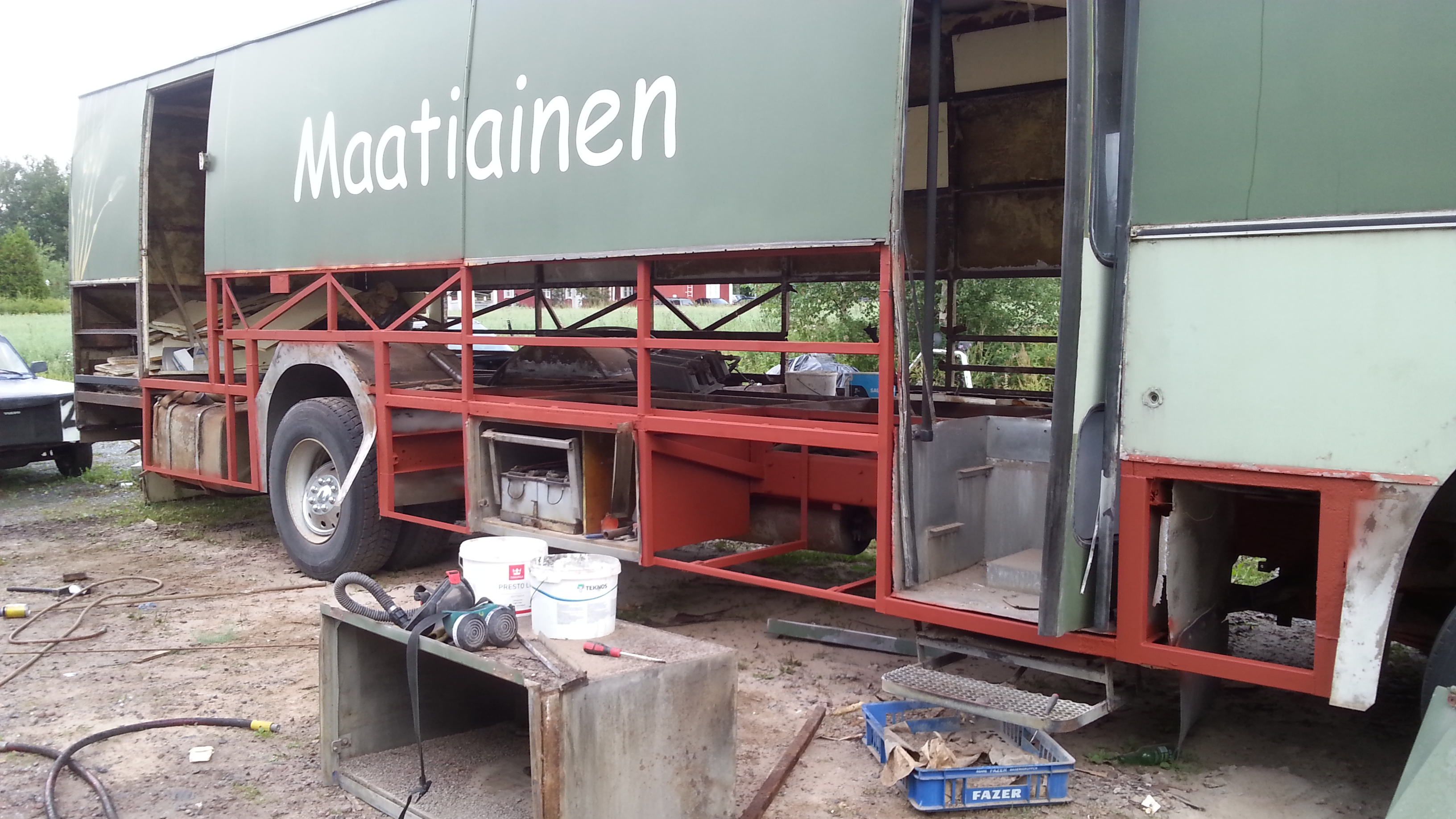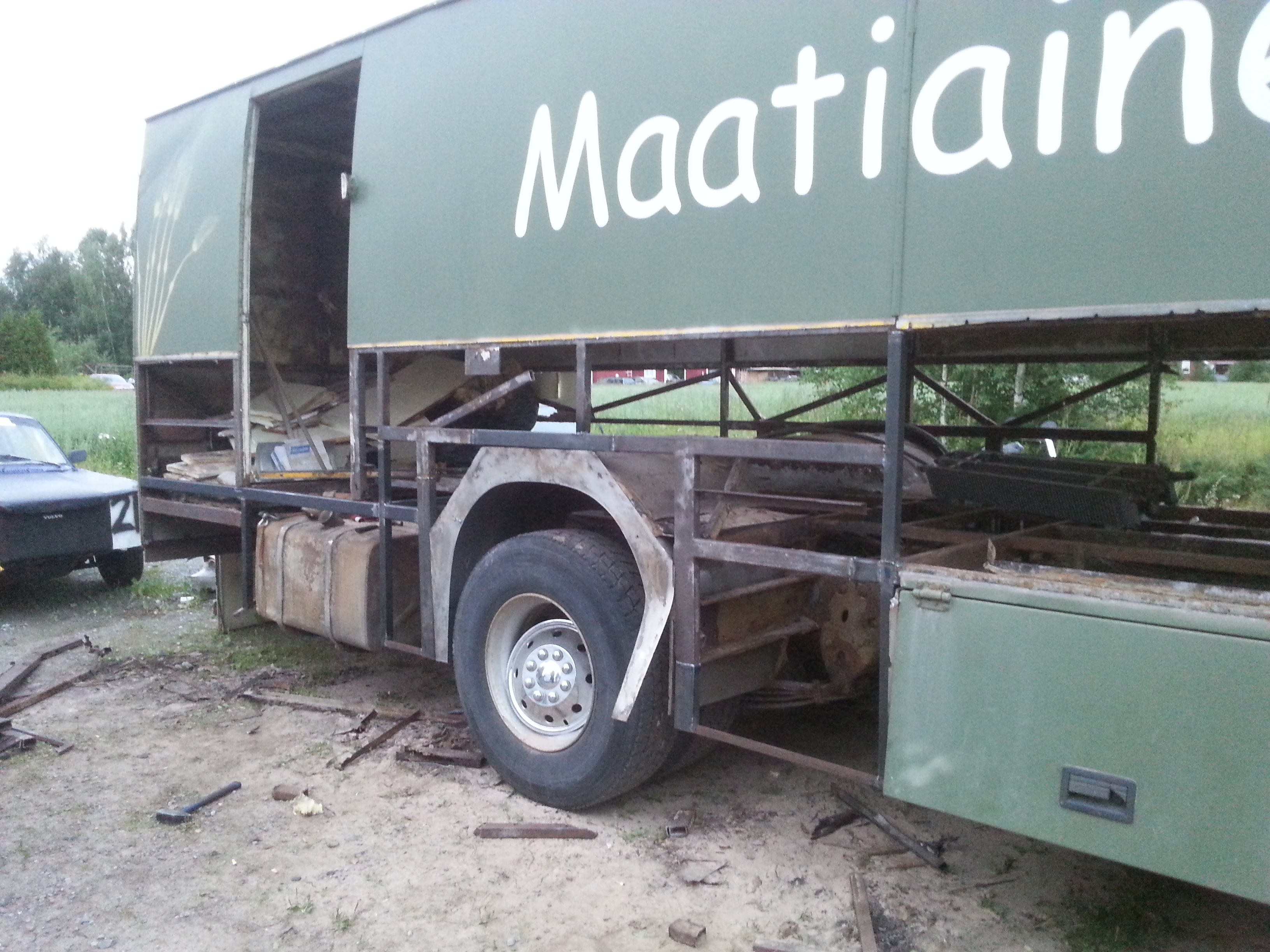 Autoa tutkittiin ja ihmeteltiin hetki ja ainoaksi vaihtoehdoksi jäi purkaa kaikki pois. Lattiavanerit märäntyneitä, kylkipellit rämisi kun oli lähes irti jne.