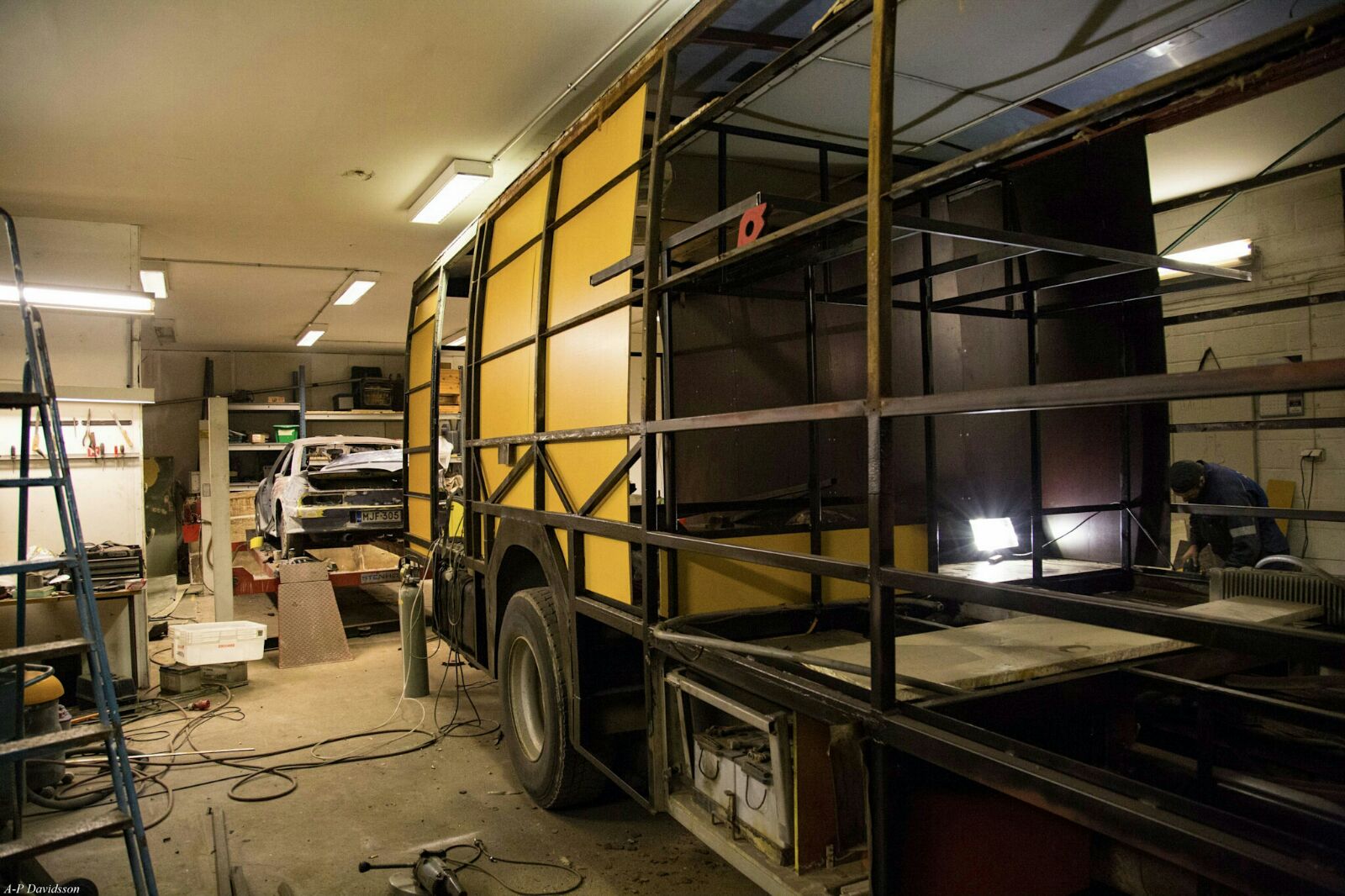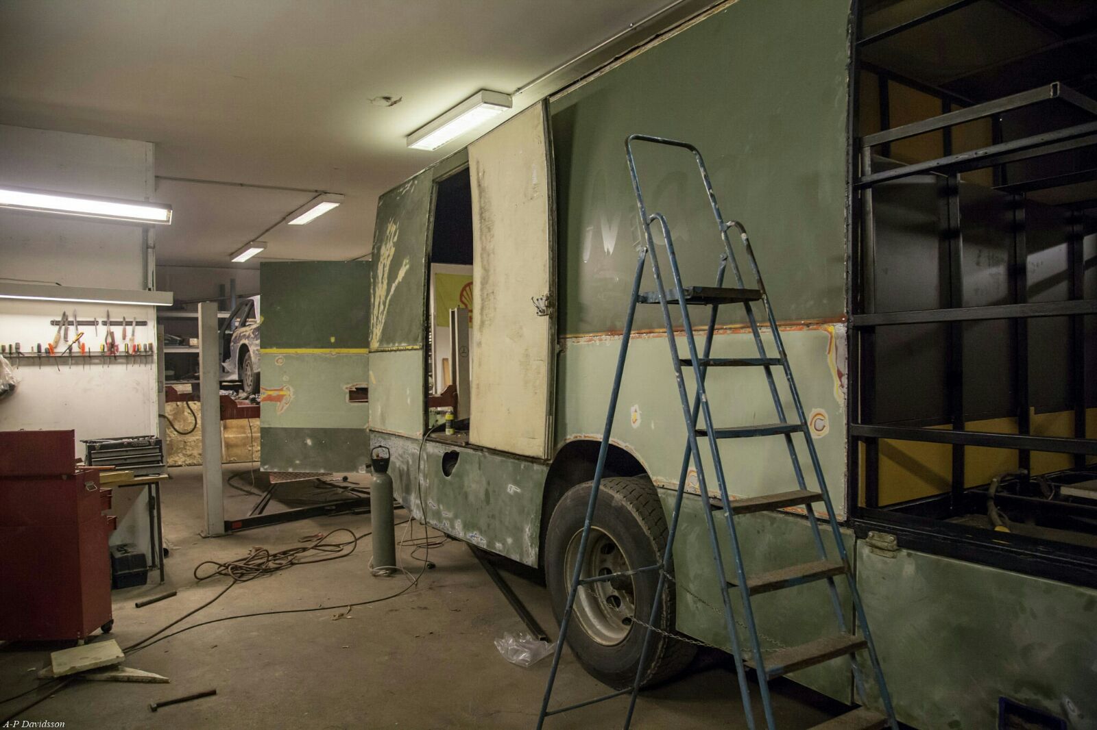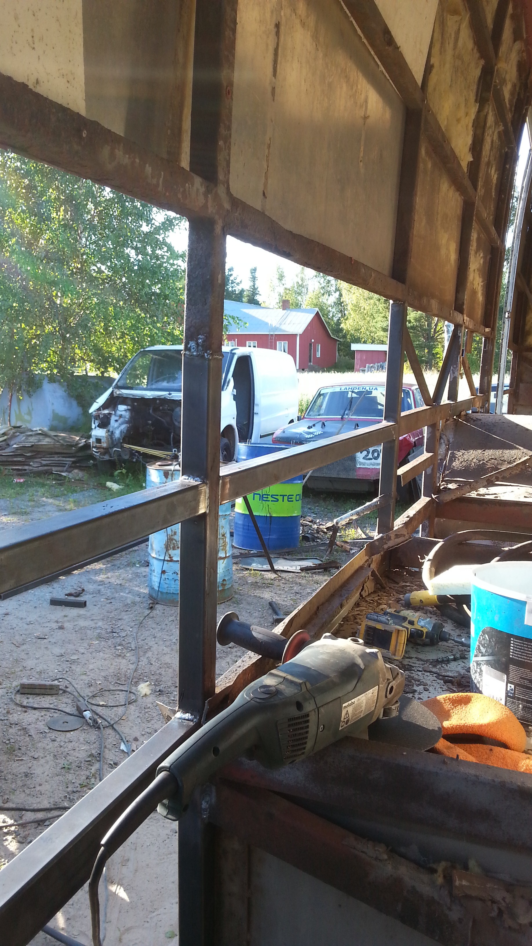 Kanikka saatiin sisälle ennen pakkasia ja jatkettiin purku sekä hitsaushommia. Kylkipellit pois ja pätkäkerrallaan uutta putkea tilalle... Kaikki laatikot poistettiin ja märäntyneet vaihdettiin, hiekkapuhallettiin ja maalattiin. Kuulostaa helpolta (ja niin se onkin) mutta moni varmasti tietää että silti aivan järjetön homma...