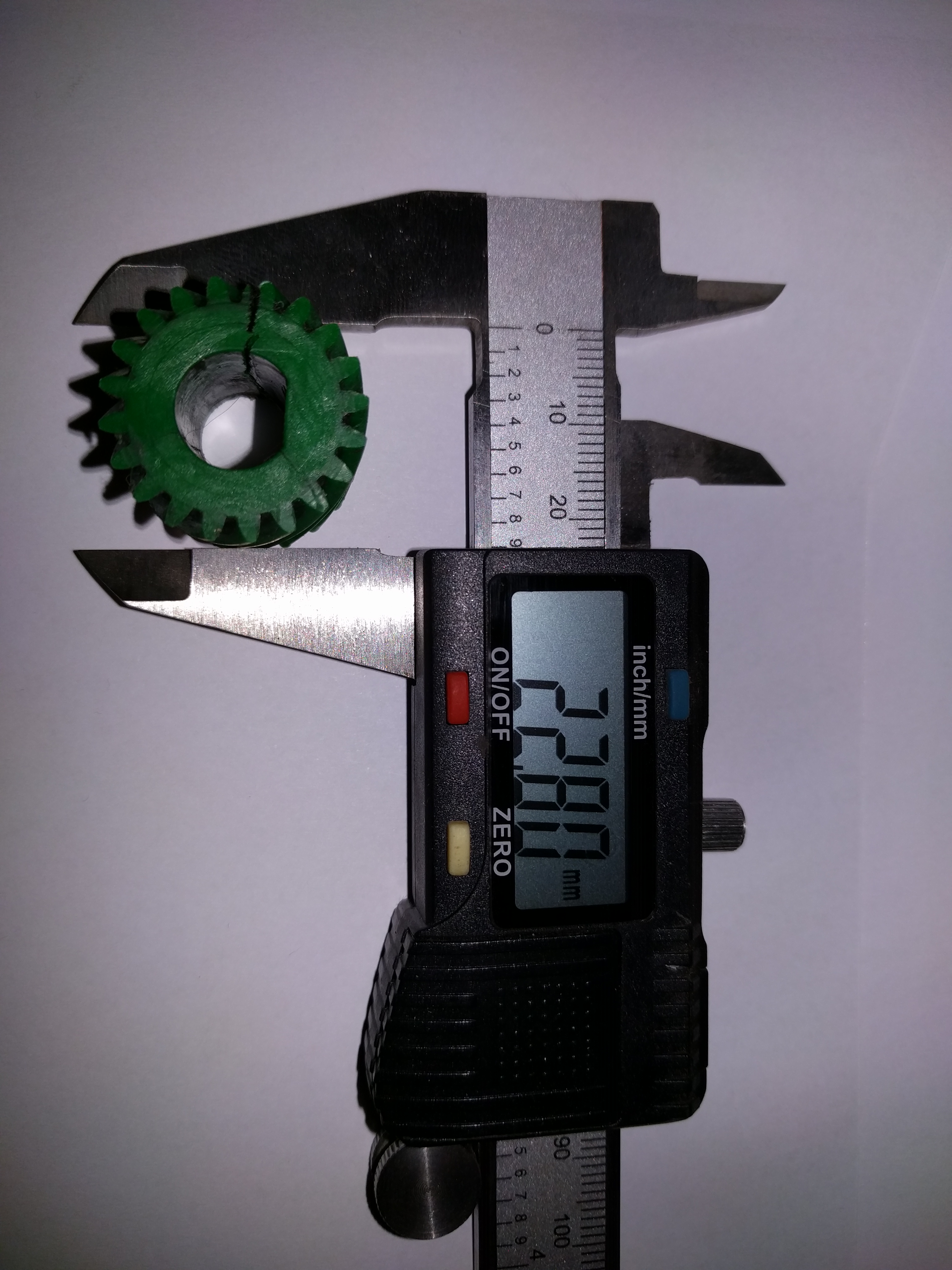 Oletus siis on, että evolventtiprofiili ja isossa pyörässä 100 hammasta. Akselivälin passailin sitten siten, että päähalkaisija menee tuonne 22,806 mm. Toisaalta noi kyllä näyttää siltä, että profiilinsiirtoa ei ole tehty (ainakaan noin suuurena), joten vähän auttaisi jos saisi sen ison pyörän hammasluvun (ja akseliväli olisi bonusta). Modulilla 1 mm ja profiilinsiirrolla 0 hampaan korkeus olisi 2,25 mm (noilla arvoilla on 2,21 mm) ja päähalkaisija 23,727 mm mikä poikkeaa ikävästi tuosta tönärin arvosta. Kuva siitä isosta pyörästä voisi auttaa profiilinsiirron arvioinnissa.