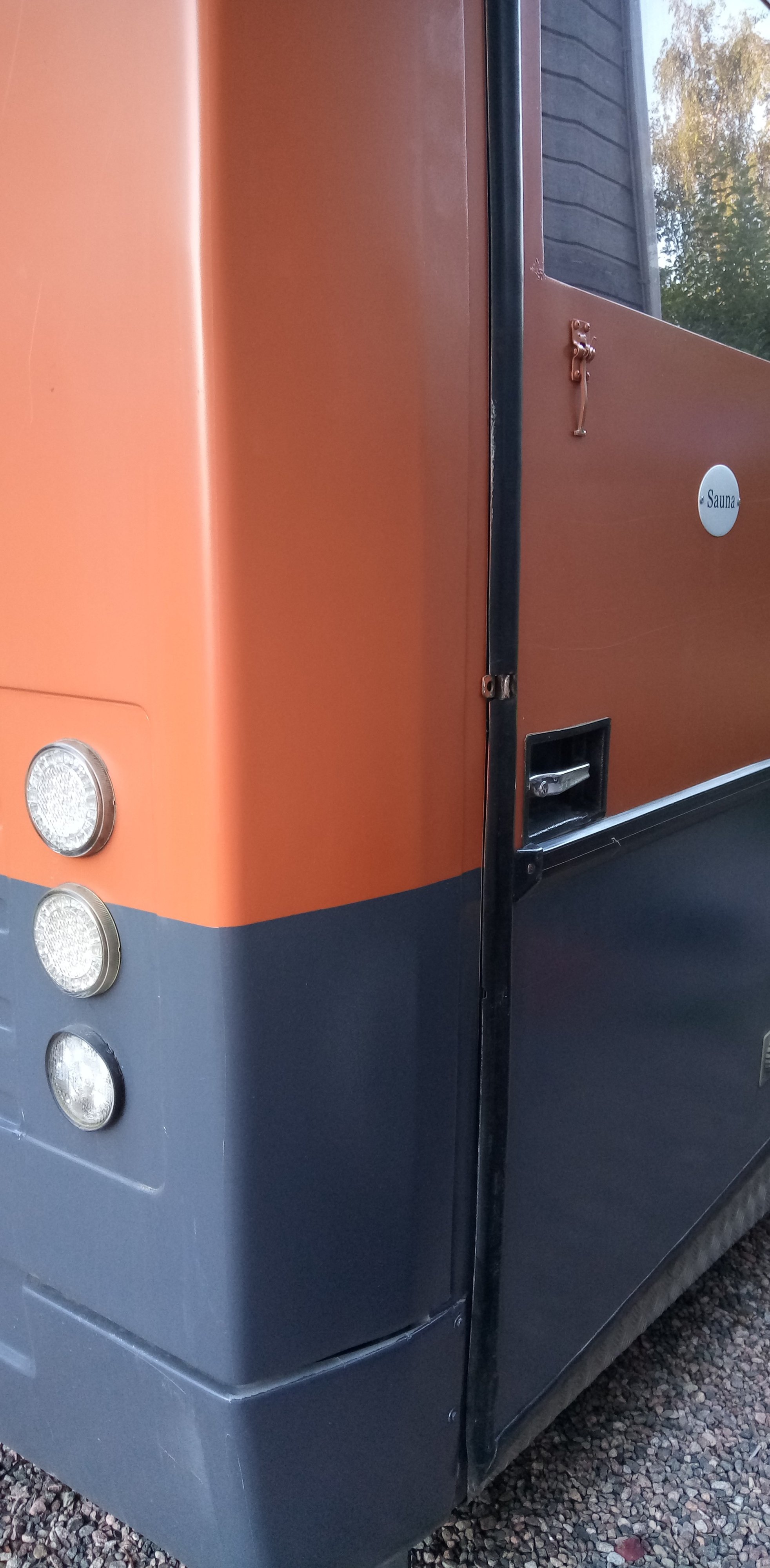 Mää sipaisin viime viikolla tankkausreissun päätteeksi kyljestä vähän taka-akselin etupuolelta pihasaunan räystääseen.