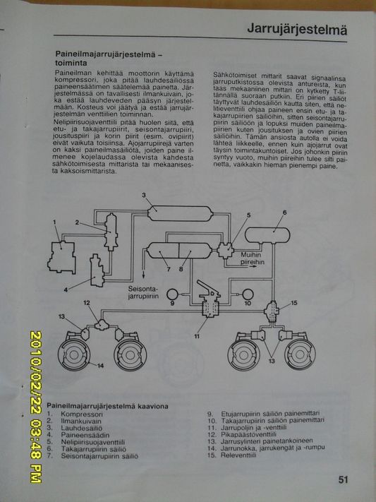 kyllä se pitäis olla... märkäsäiliö, se on ensimmäinen pönttö kompuran jälkeen, mihin scanian ja volvon kompressorin öljyt kertyy... Sisussa (huom.isolla) ja mersussa paineensäädin zubzuttaa ylimääräiset vapaakäynnillä kertyvät öljyt ulos (myyränpelotin).... scaniassa ja volvossa kompuran venttiilit vapautuu, jolloin mahd.ylimääräisesti väljistyneet männät "vatkaa" ilmaa ja samalla kertyvää öljyä keskenään, josta sitten "purskahtavat" paineilman mukana märkäsäiliöön kompuran saatua komennon antaa ilmaa.... tosin Sisun säiliöt tahtoo kadota ruosteena, kun ei sisäistä "suojausta" niin paljon..... :) On se Sisussakin ensimmäinen säiliö "märkäsäiliö", johon työkomennon aikana tulee mahdollisesti tentunsekaista "mömmöä".... se kun sekin "tenutin" toimii paremmin kun monessa nämä "liimanhaistelijat"..... Vanhoissa autoissa nuo "takaiskut" toimii ns. nelipiiriventtiileinä, mutta scaniassa ollut jarruille kaksipiirijärjestelmä lähes paineilmajarrujen käyttöönotosta lähtien. Vanhoissa Sisuissa ja mehujarrumersuissa oli toinen viisari poljinpaineelle.