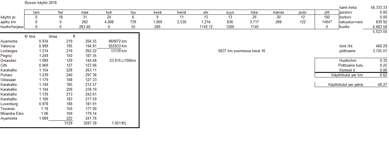 Tuli laskettua mitä kulutti bussi vuonna 2016 Vuoden aikana tankattiin 3129 litraa se maksoi 3287€ ja litrahinta oli kohtuullinen 1,051 €/litra