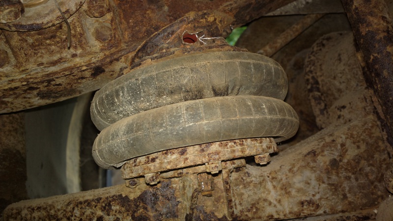 Nyt kun pitää irrottaa tuo takimmainen ilmapussi, niin eihän tuota saa irti ilman taka renkaiten, pyörien poisottamista kun tuon ilmapussin telineen pois saanti on muuten liian hankalaa kun on ahtaat paikat. Kun tuo taka ilmasäiliön ilmaputki katkes irti ilmapussin yläpäästä. Kyllä näyttää siltä, että tuolle toisellepuolelle ilmapussin yläpäähän menevä putki on joskus hitsattu siihen kiinni, ei tuota ilman pussin irroittamista pysty hitsaamaan ja pitää hitsata, juottaa vielä hyvin kun ilma vuotaa pienestäkin reijästä. Tuo ilmapussin kumi on siinä vielä niin lähellä, että syttyy palamaan eli tuo kumi pitäs myös irroittaa. Ja onhan tuo pussiteline saatava irti jos sen uusii vaikka kokonaan. Nuo pussikumit näyttää vielä hyviltä. Jos vielä joskus ostan toisen linja-auton niin pitää olla niin uutta mallia, että ei tarvii heti ruveta ruostevaurioita korjaamaan. Mieluiten alustakin rosterista. Nytkin kesäajelut meni piloille tuon vian takia. Taitaa tämä nykynen auto jäähä varastoksi pihanperille tai annan romu-ukolle.
