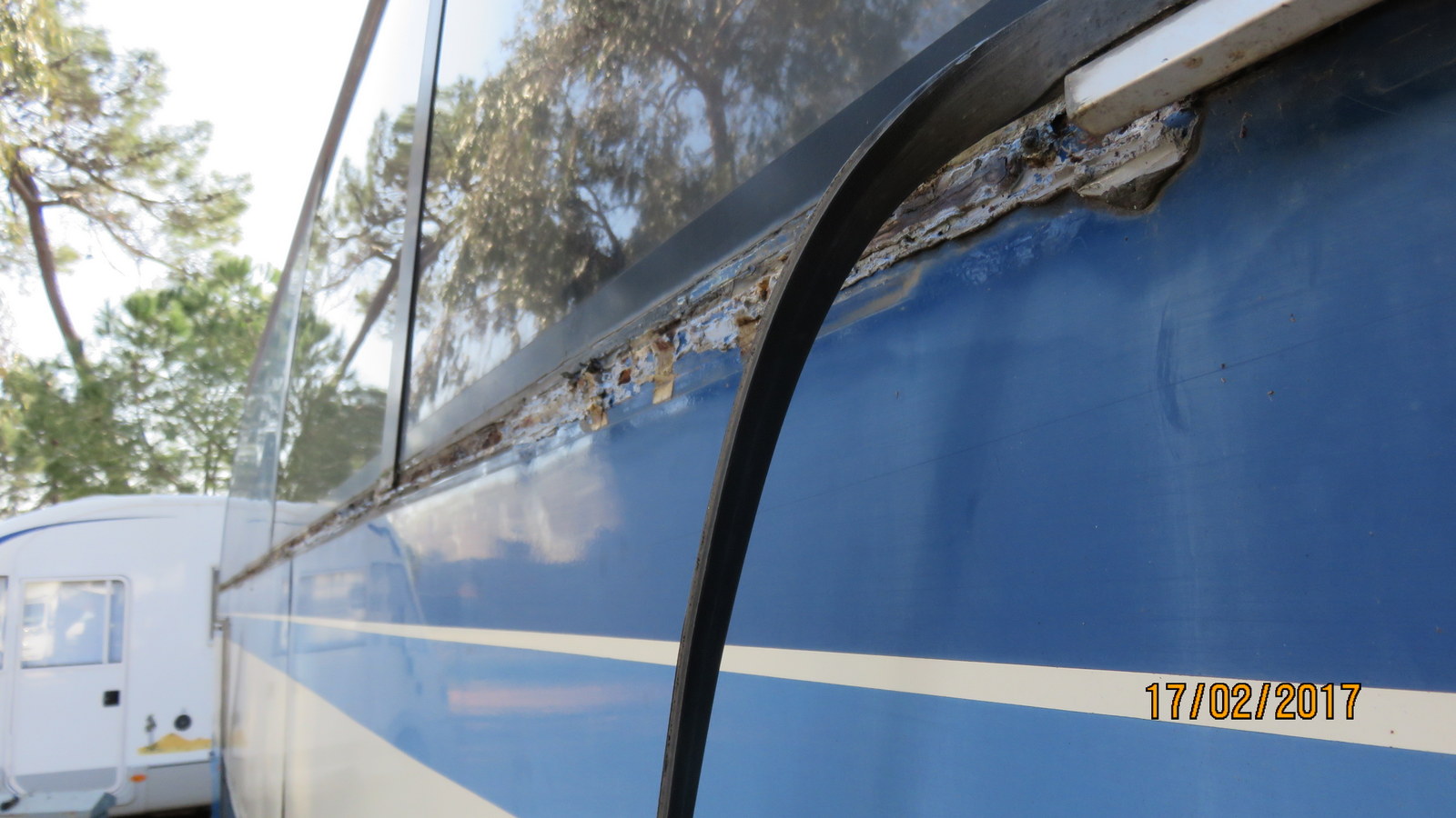 Ikkunan alapuolinen lista oli pitkän pätkän irti ja samoin kylkipellin kiinnitys niitit olivat poikki. Eilen otin sen pois, niitit porasin irti ja lista maahan, kyllä tässä tarvii näköjään irroittaa etumainenkin lista. Laitan kuitenkin ensin valmiiksi takimmaisen listan pellit liimalla kiinni ja jos tarvetta muutama niitti tukemaan kuivumista. Nyt saumasta on päässyt vesi ikkunan alapuoliseen palkkiin. Kaikki pinnat on ensin putsattava samoin kylkilista.