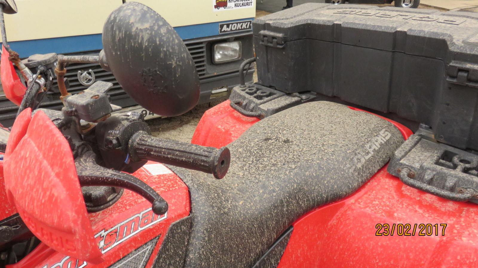 Tässä sitä seisotaan no otin autoa eteenpäin 2m jotta sain mönkijän ulos mutta perutin takaisin vanhoihin pyöränjälkiin auton. Hyvin starttasi Volvon kone olihan seseisonut 7.12.2016 alkaen hyvät savut irtosi ja naapuriauto häipyi hetkeksi harmaaseen pilveen. Onneksi eivät olleet paikalla.