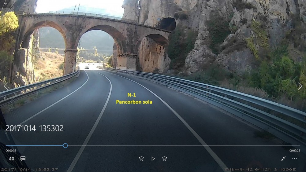 14.10 jatkoimme etelään Bordeaux rengastiellä tankkasin 100 litraa kallista dieseliä a' 1,325€/L TieBordeauxin eteläpuolella on tuntitolkulla suoraa ja tasamaata tien pitäjä on laittanut muutaman pikku mutkan että letkasta saadaan poistettua nukahtaneet kuskit. Puolituntia ennen espanjan rajaa maisema muuttuu kolmiulotteiseksi ja sitä saa aina etsiä sopivaa vaihdetta niin ylöspäin kuin alaspäin mennessä. Pian kuitenkin tie kääntyy sisämaahan päin ja nousee tasaisesti 40 km matkalla 600 m eli se ei ole jyrkkä mutta jatkuva nousu pitää koneen kuumana vihreän ylärajalla. Jotta se pysyi siinä piti rajoittaa tehoaniin että nopeus vaihteli mäessä 67 - 85 km/h Ulkolämpötila vaihteli 22 - 24 - 27 välillä. Kirjoittelen tätä majapaikamme parkkipaikalla La Brujula niminen Taverna ja hotelli vähän itään Burgosista.