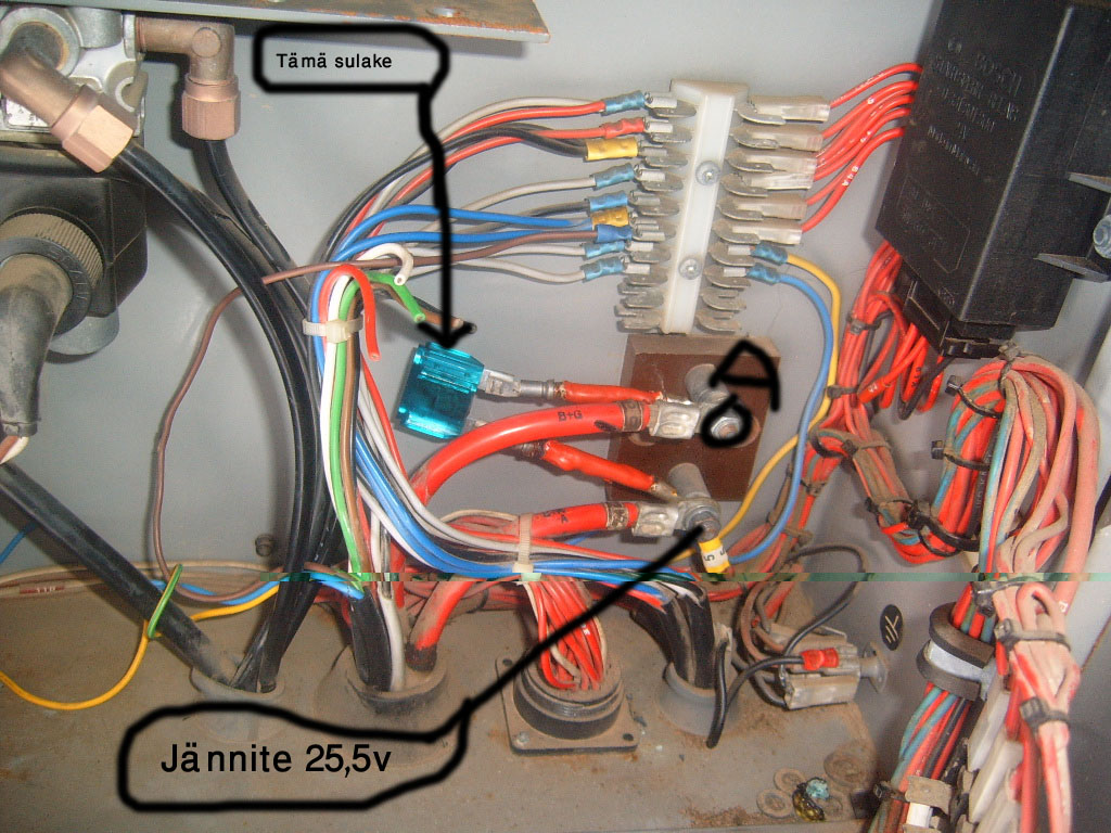Täytyy sanoa että onpa outo kytkentä. Johtomerkinnöistä päätellen laturilta startille menevä kaapeli, mutta en ole koskaan nähnyt sulaketta tuossa paikassa. Tuo on koritehtaan viritelmä, ilmeisesti otettu jollekin korilaitteelle tuosta syöttö. En osaa neuvoa ilman kaaviota, tuolla voi olla vaikka mitä takana.