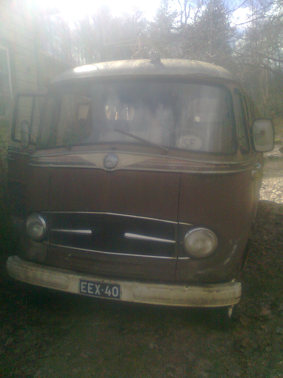 Tervehdys uudelta kylähullulta.Tuli kaivettua vanha teidentukko tuolta ruusupuskan takaa maatumasta.Auto on Mercedes Benz L-408 vm.65,etenemisestä huolehtii 1,9 bensakone,ollut aikoinaan Porin vpk:n miehistönkuljetusautona (ei tolla kyl mihinkään tulipaloihin oo voinut ehtiä,ehkä jälkisammutushommeleihin