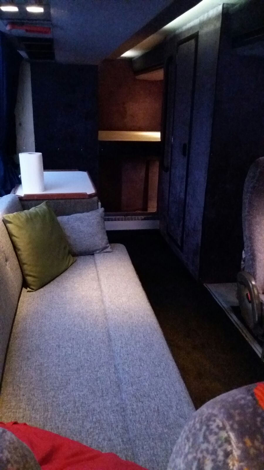 toisessa reunassa väliseinällä erotettu ykköspunkka. Alla oleva aukko on alasängylle jossa nukutaan poikittain autoon nähden.
