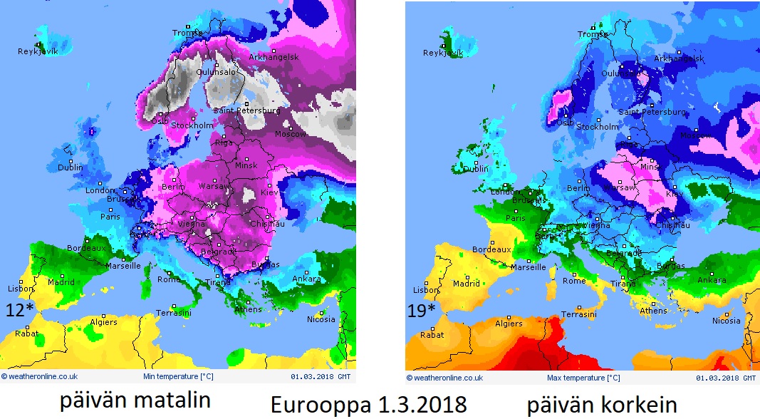 Siksi kylmä kun pohjoisessa oleva lämmin ilma työntänyt kylmän sieltä eurooppaan. Pohjoisnavalla oli samaan aikaan plusasteita. Ei ilmaston lämpeneminen tarkoita sitä että ilmat olisi lämpimämmät, vaan että että ilmaston käytös muuttuu kun lämpötilaerot eivät ole alueellisesti ennallaan.KajNyy1 kirjoitti:Se on kevät nyt
